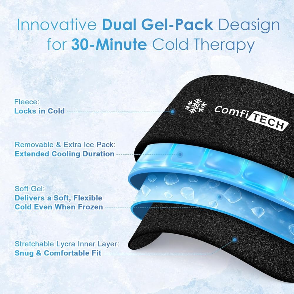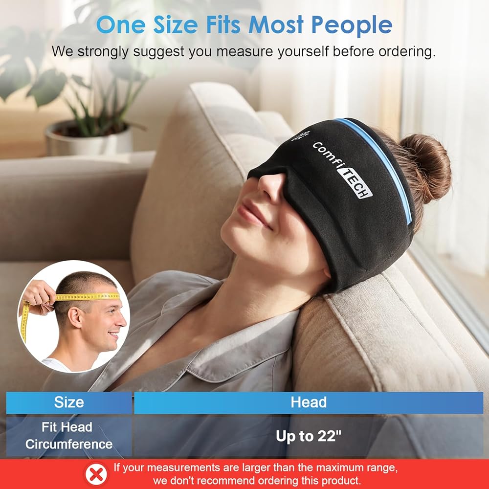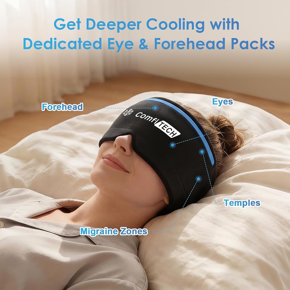 ComfiTECH Dual-Gel Migraine Relief Cap Extended 30-Min Cooling, Detachable Cold Pack & Flexible Gel Head Ice Wrap Face Mask Soothing for Headache, Sinus, Puffy Eyes, Tension and Stress
