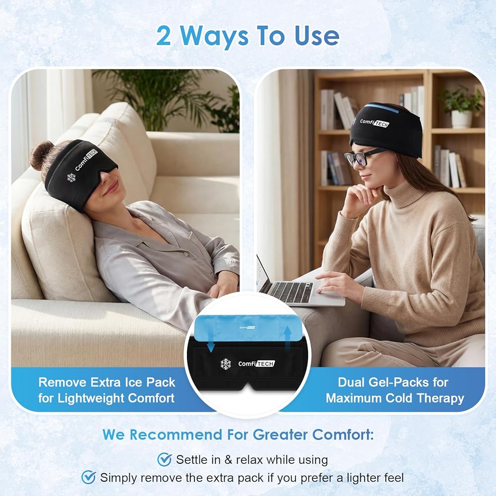Dual-Gel Pack Design for Longer & Deeper Cooling - When a migraine hits, the last thing you want is ice packs that warm up too fast. That's why we created a detachable dual gel system that actually delivers. Freeze for 2 hours and enjoy 30+ minutes of consistent cooling that reaches deep into your sinuses and temples. That's nearly twice as long as basic headache caps. Plus a flexible inner gel that stays soft when frozen for a snug fit. No need to interrupt your relief mid-session
