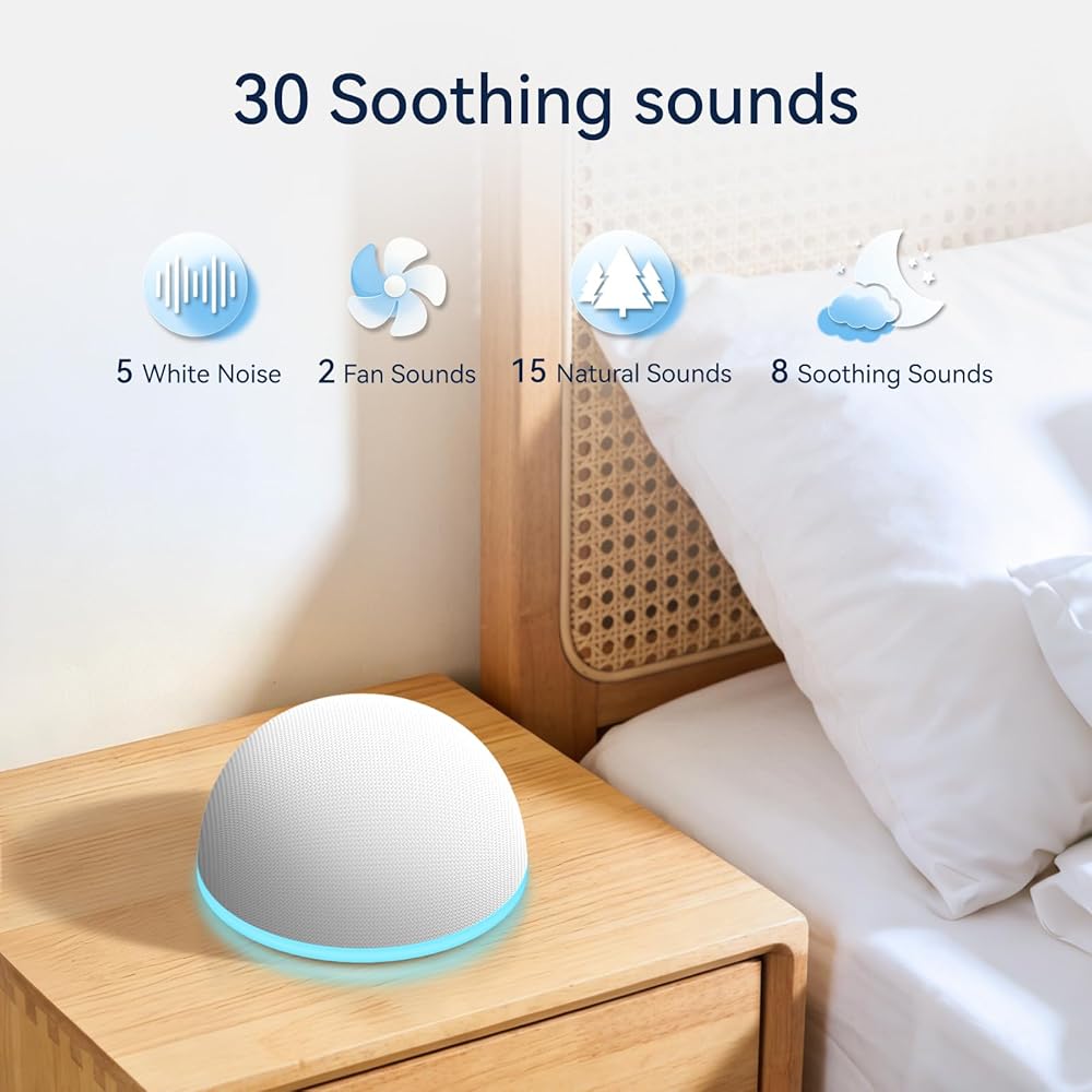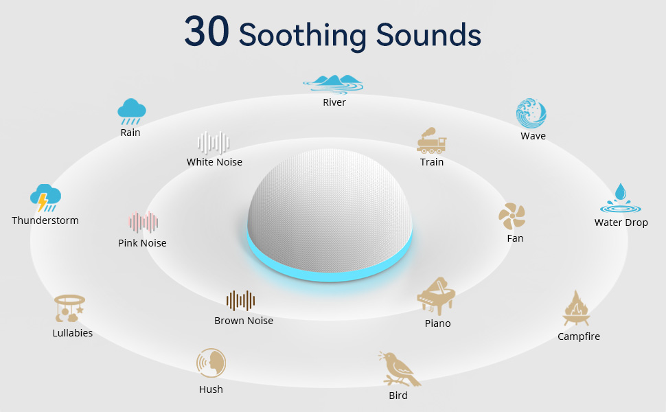 30 صوتًا غير متكرر لنوم أفضل: تحتوي آلة الصوت المحمولة هذه على 30 صوتًا مهدئًا. 5 ضوضاء بيضاء (ضوضاء بيضاء، ضوضاء بنية، ضوضاء وردية)، 2 أصوات مروحة (مروحة ناعمة، مروحة عالية)، 15 صوتًا طبيعيًا (مطر، عاصفة رعدية، نهر، أمواج، نار المخيم، قطار، إلخ.)، و8 أصوات مهدئة (صمت، بيانو، تأمل، نبضات القلب، إلخ.). تخلق آلة الضوضاء البيضاء بيئة نوم هادئة لمساعدتك أنت وطفلك على النوم بشكل أفضل وهي مثالية للأطفال والرضع والكبار وكبار السن.