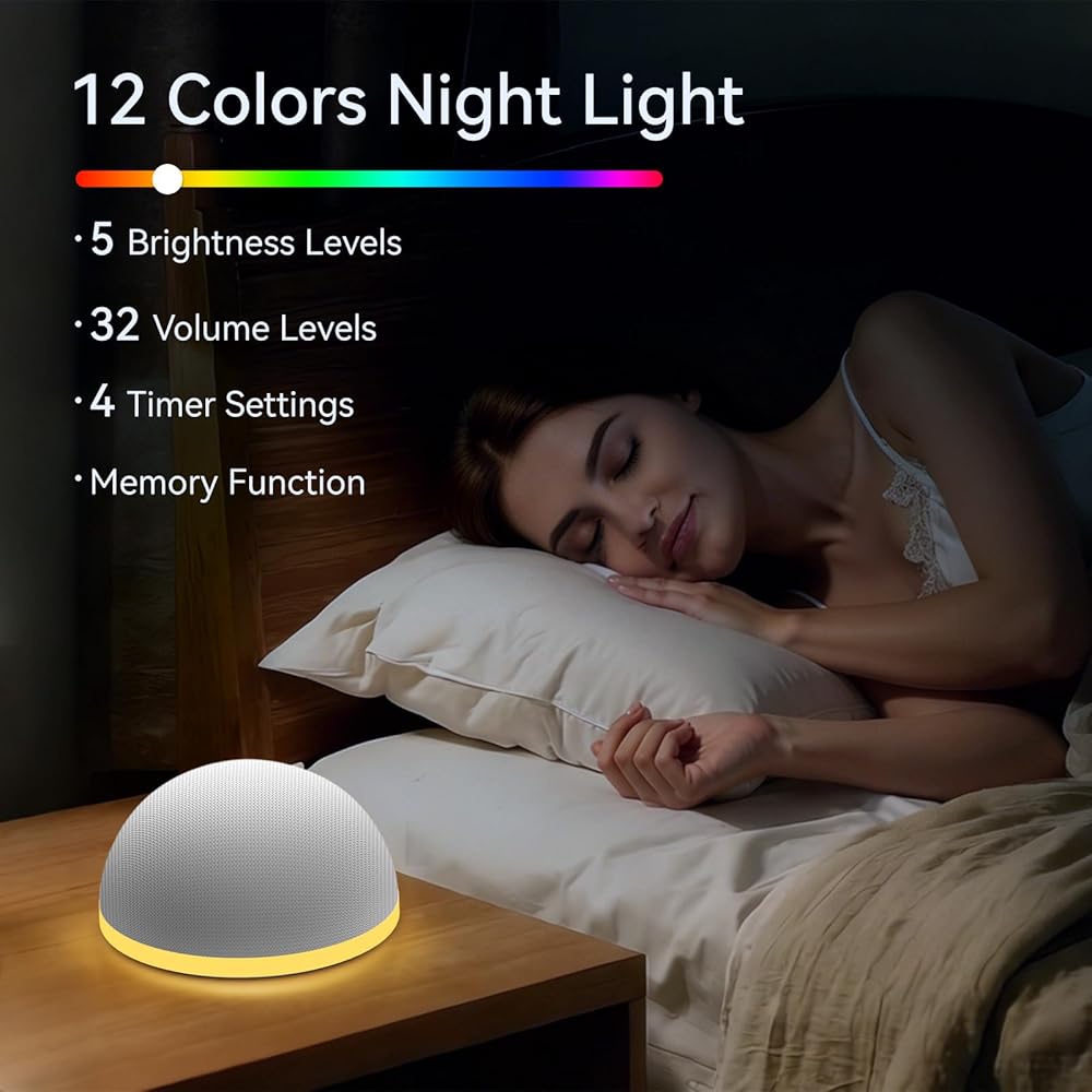 ☞【حجم 32 مستوى و12 لون إضاءة ليلية】 تحتوي آلة الصوت الصغيرة على 32 مستوى صوت قابل للتعديل. من الهمس اللطيف إلى القوة الكافية لإخفاء الشخير أو ضوضاء المرور أو نباح الكلاب. لا يوجد تشويه عند الحد الأقصى للحجم. مثالية للحضانة والمكتب والمنزل. تحتوي آلة النوم على 12 لونًا من الإضاءة الليلية، مما يخلق أجواء دافئة ورومانسية مع ألوان إضاءة وسطوع قابلة للتعديل، مما يجعلها مثالية للعناية بالطفل ليلاً.