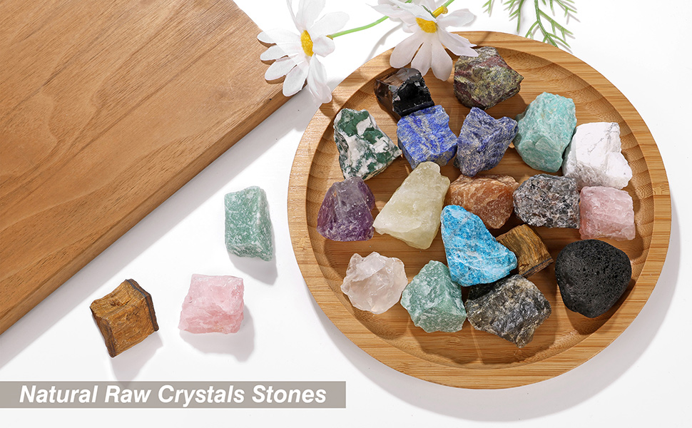 البلورات والأحجار الخام الطبيعية. لم يتم سحق هذه الحجارة أو قطعها أو صقلها، مما يحافظ على جمالها الأصيل والوعر وأشكالها الهندسية الطبيعية. كل قطعة فريدة من نوعها!