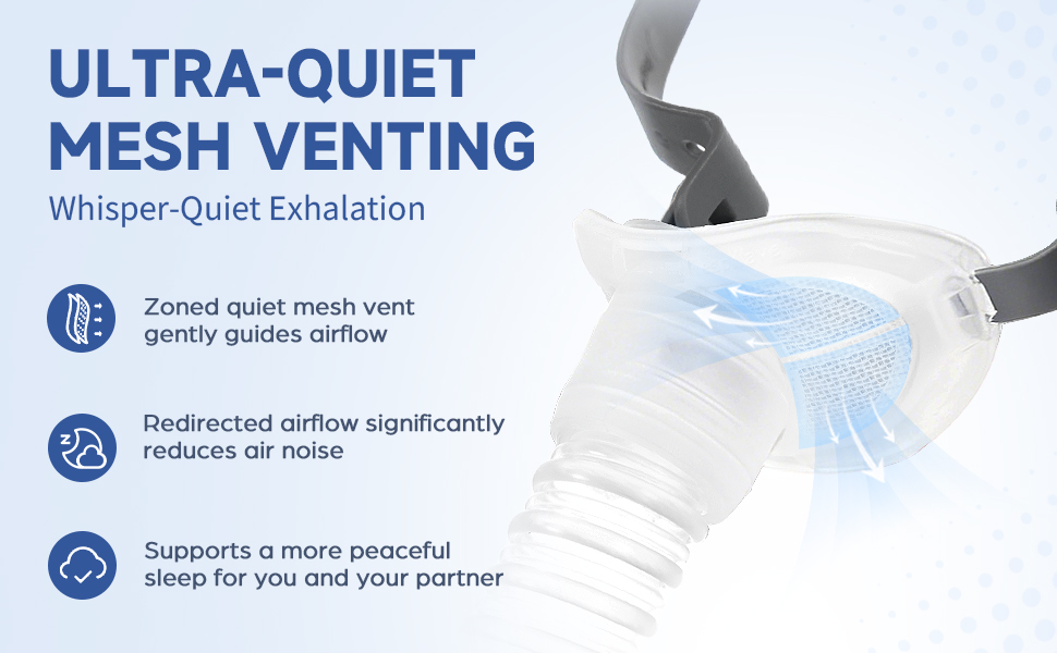 تقنية تهوية شبكية فائقة الهدوء: نوم دون إزعاج. يحاكي الإطار الخاص بنا تصميم التهوية الشبكي المتقدم (مشابه لنمط QuietAir) لتوزيع هواء الزفير بلطف. وهذا يقلل بشكل كبير من ضوضاء تدفق الهواء وتيارات الهواء، مما يخلق بيئة هادئة وهادئة لك ولشريكك في السرير.