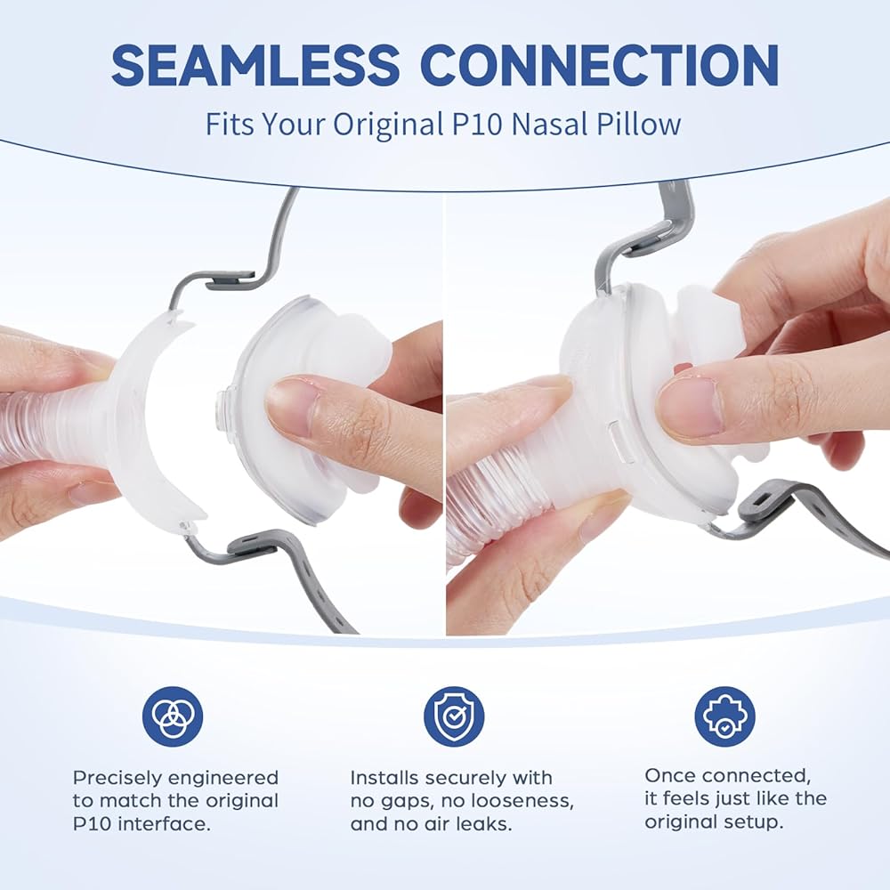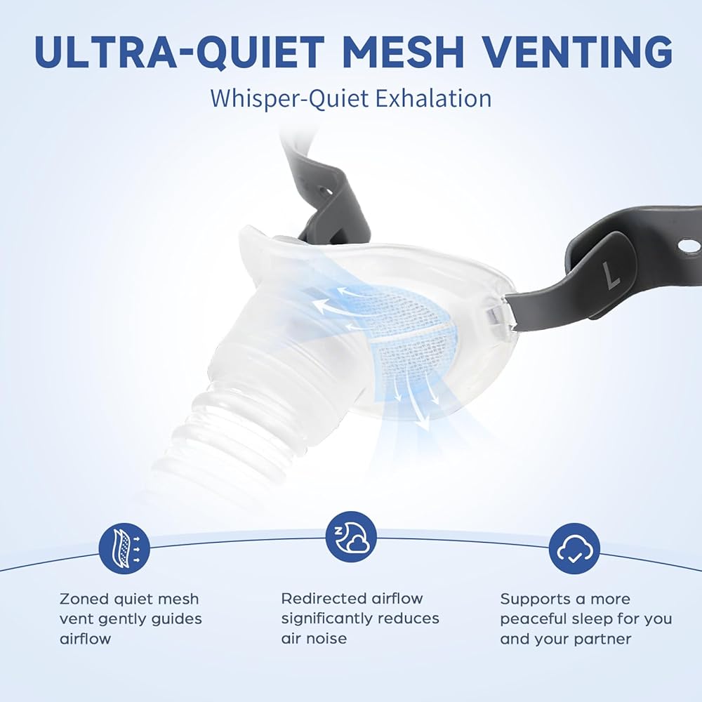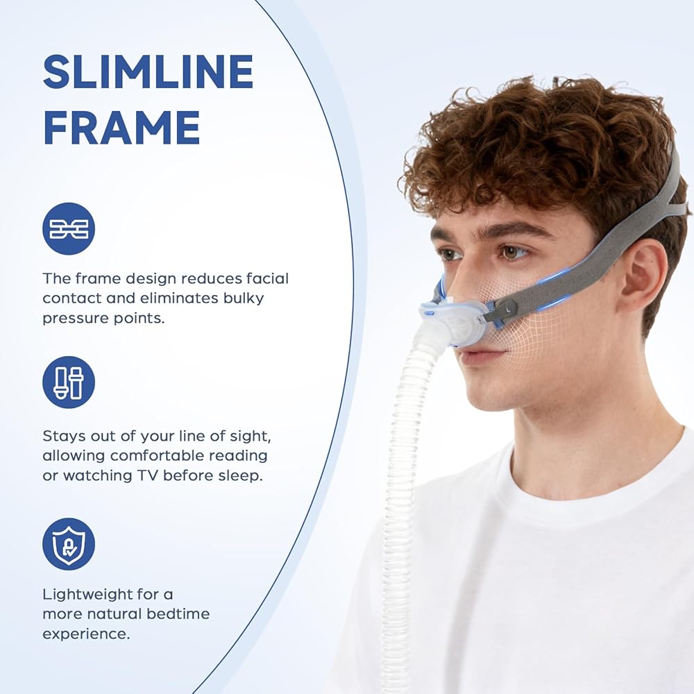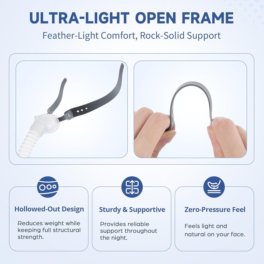 مرساة الاستقرار الديناميكي: يعمل الإطار كمرساة قوية للوسائد الأنفية. بالإضافة إلى غطاء الرأس المرن، فإنه يحافظ على الزاوية الصحيحة للوسائد على أنفك، مما يمنع تحركها أثناء الحركة. استمتع بضغط علاجي ثابت حتى أثناء تغيير وضعيتك طوال الليل.