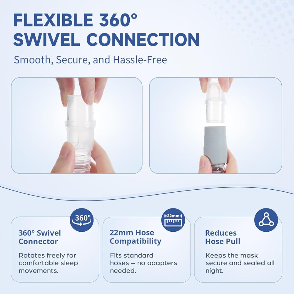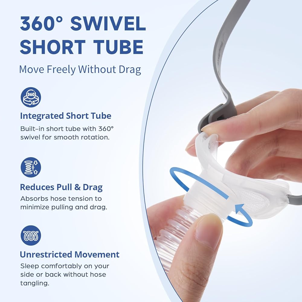 أنبوب قصير مدمج مع دوران 360 درجة: حرية الحركة. يتميز الإطار بأنبوب قصير خفيف الوزن متصل بشكل دائم ومجهز بدوران 360 درجة. يعمل هذا التصميم المرن كحاجز بين القناع والخرطوم الطويل، مما يقلل من السحب ويسمح لك بالنوم بشكل مريح على جانبك أو ظهرك دون تشابك الأنبوب.