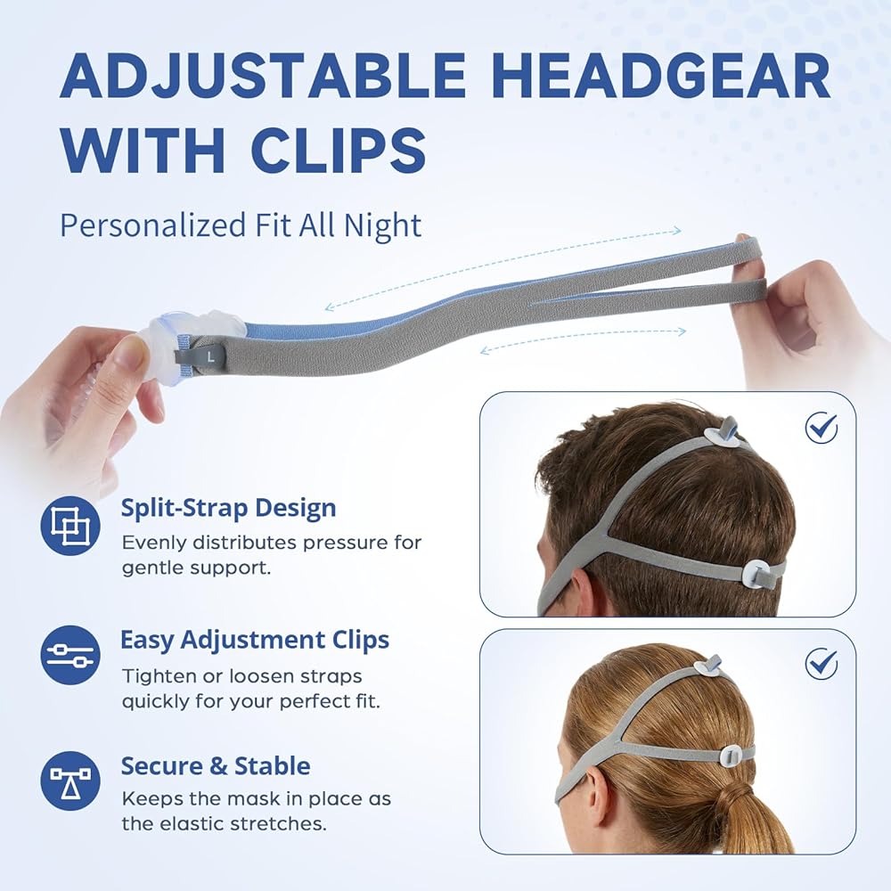 غطاء رأس مزود بمشابك تعديل: يشتمل على غطاء رأس مرن بحزام منفصل مع مشبكين للتعديل (مشابك مستديرة بيضاء). تسمح لك هذه المشابك بشد أو فك طول الحزام بسهولة للحصول على مقاس مناسب، مما يضمن بقاء القناع آمنًا طوال الليل حتى مع استرخاء الشريط المطاطي بمرور الوقت.