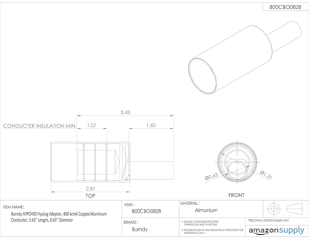 Types AYPO aluminum compression adapters are designed for reliable termination of aluminum and copper conductor in mechanical connectors. Typical applications include mechanical connectors in molded case circuit breakers, panel board equipment and meter sockets. Factory prefilled with the proper amount of Penetrox joint compound. Pentrox, Burndy oxide inhibiting compound with conductive metallic particles penetrates aluminum oxide between strands and forms an air-tight connection. EPDM rubber covers are supplied with each connector and are rated for 600 Volt, eliminates taping. Supplied in a plastic convenience pack. The cover and connector are kept together and free of foreign material until used. Connectors are clearly marked with catalog number, wire size, and color coded die index. Provides clear, easy to use information to lower installed cost. 1.60-inches plug length. 3.16-inches cover length. 1-1/8-inches strip length.
