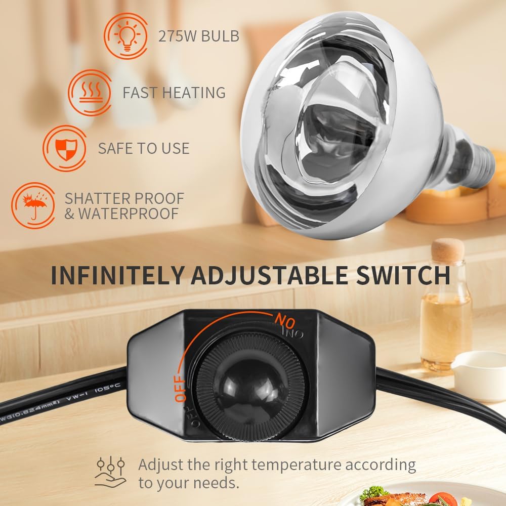 1.Optimized Heat Retention: The specialized 275W bulb generates rapid and efficient heat, creating a warm zone that preserves the freshness and temperature of your food for extended periods. Say goodbye to cold burgers and soggy fries!