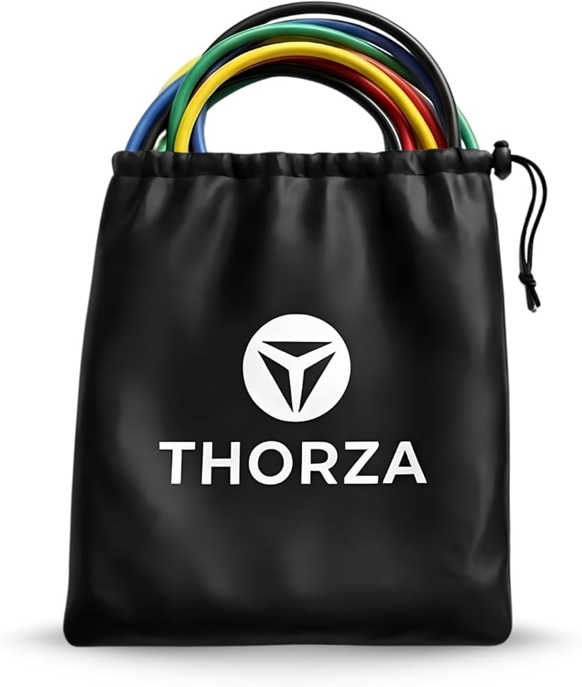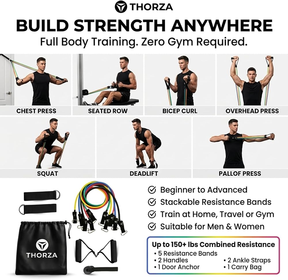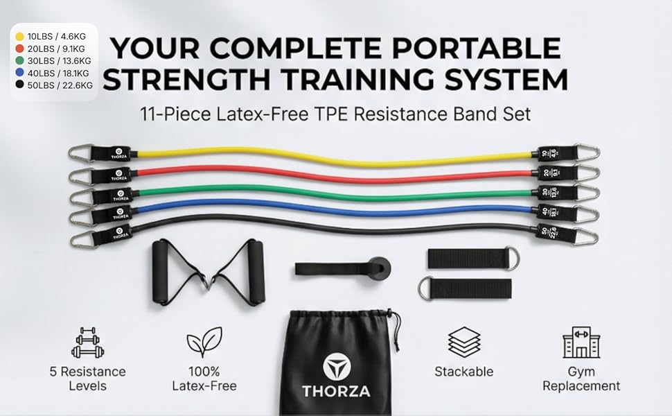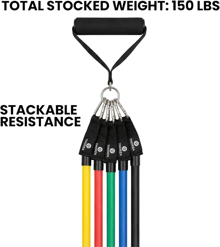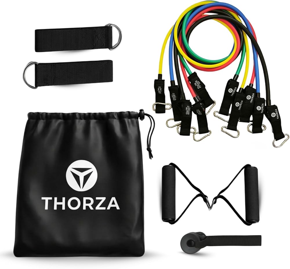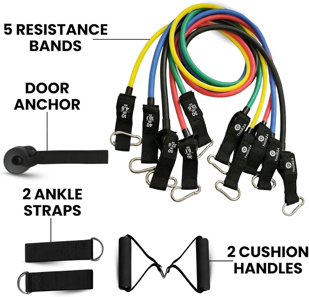مجموعة ثورزا المكونة من 11 قطعة لتدريب قوة الجسم بالكامل مع أشرطة المقاومة - 5 مستويات من أشرطة التمرين الأنبوبية، بدون شريط مقاومة من اللاتكس TPE - مرساة الباب والمقابض وأشرطة الكاحل وحقيبة واحدة