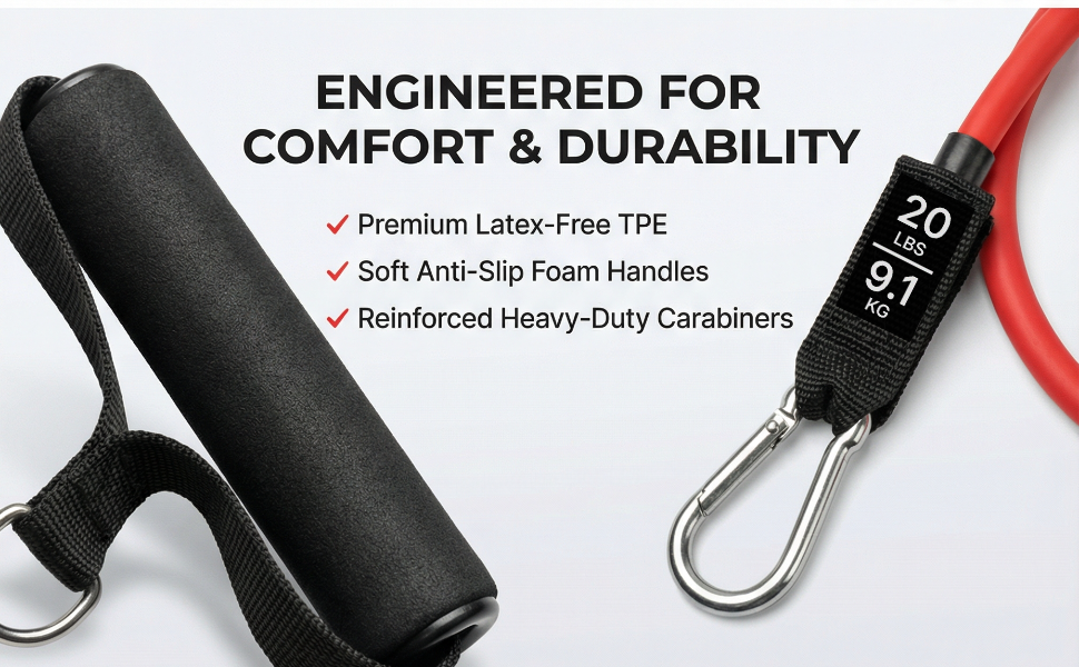 مادة TPE خالية من اللاتكس: مصنوعة من مادة TPE عالية الجودة خالية من اللاتكس، وصديقة للبشرة ومرنة للغاية لمقاومة سلسة. مصمم لمتانة طويلة الأمد، وتقليل مخاطر الانقطاع والأداء المتسق أثناء التدريبات المكثفة.