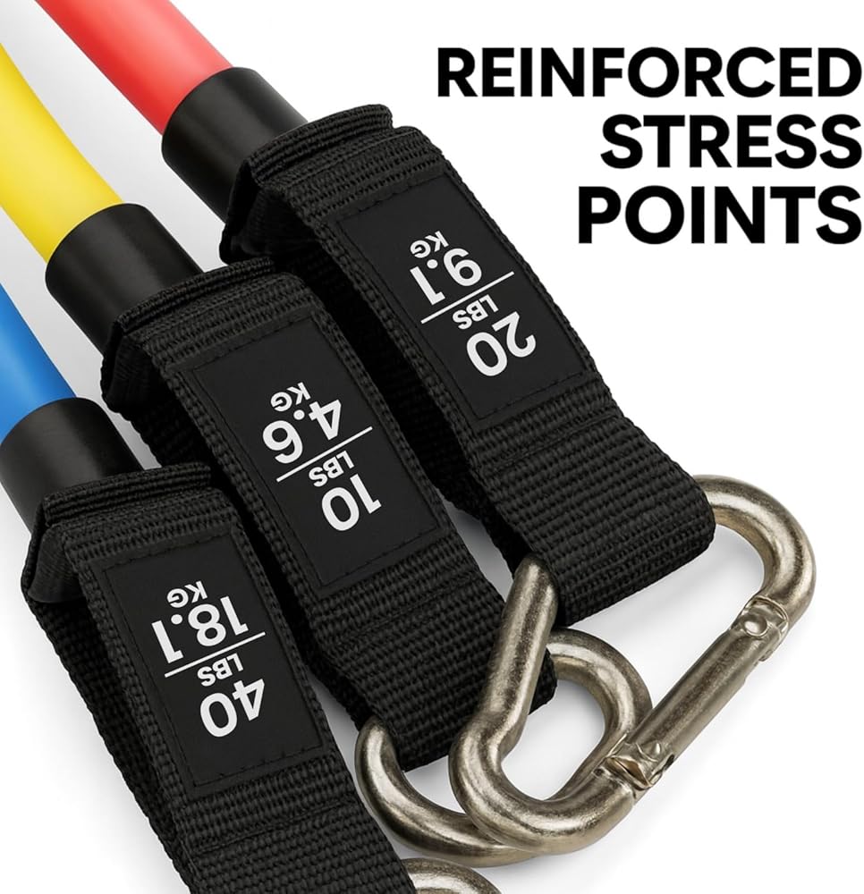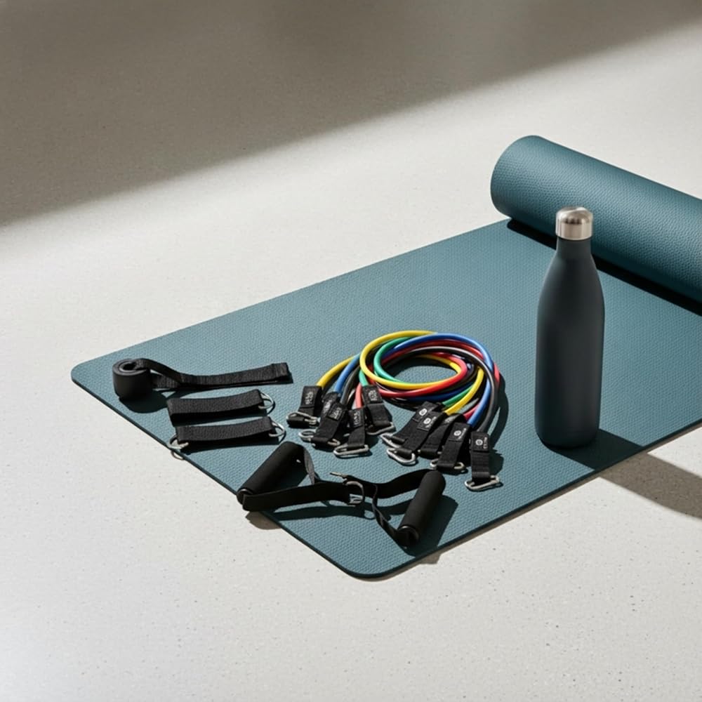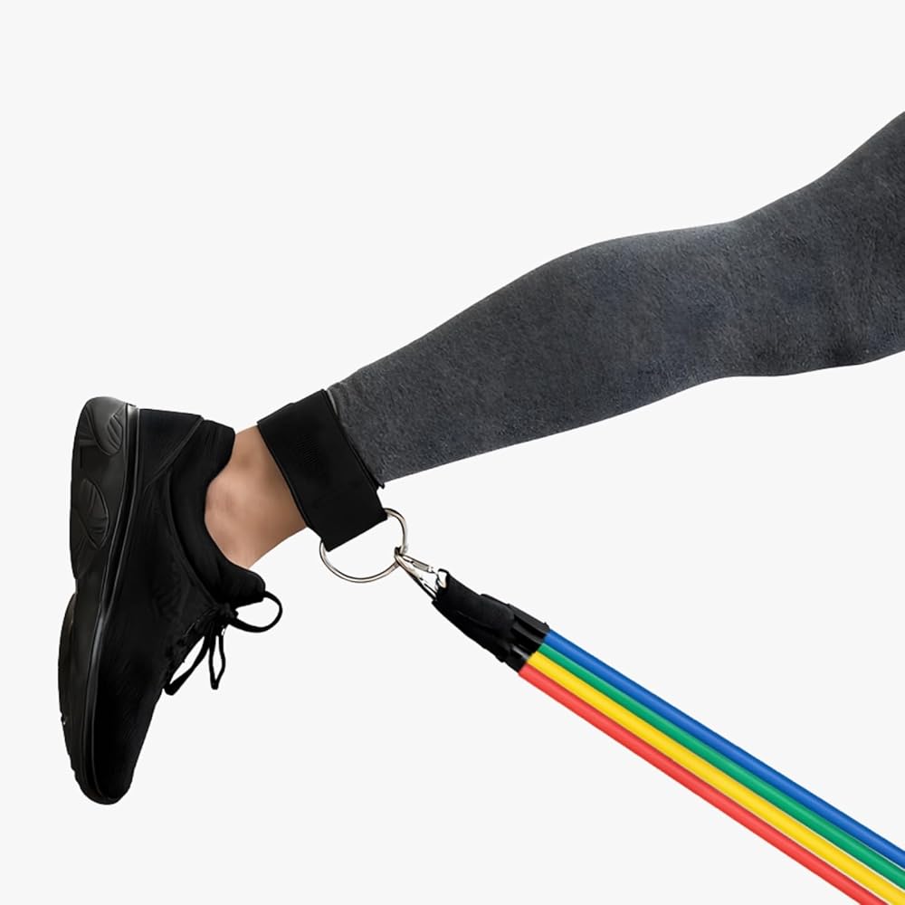 مجموعة كاملة مكونة من 11 قطعة: تتضمن 5 أشرطة مطاطية مقاومة للأنبوب، ومقبضين مبطنين ناعمين، وحزامين للكاحل، ومرساة باب، وحقيبة حمل واحدة. مثالي لتدريبات القوة والمرونة وHIIT والبيلاتيس وروتين اللياقة البدنية الوظيفية.