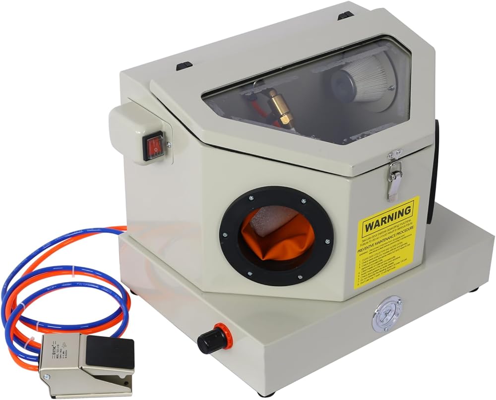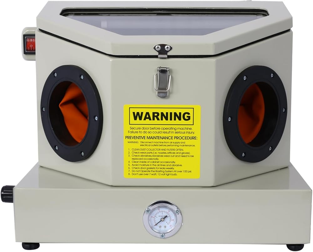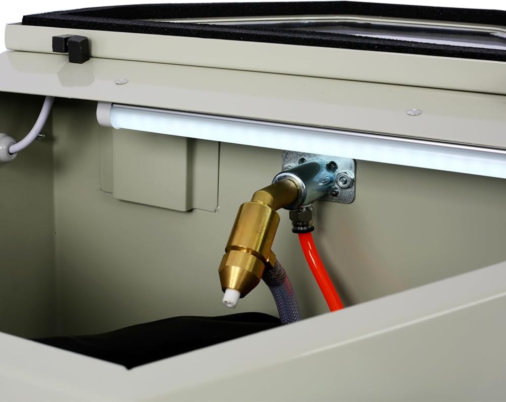 Mini Sandblaster features an ergonomic and compact design for comfortable operation. Its heavy steel construction with built-in blast gloves ensures durability and helps reduces sand leakage. A bright lighting system enhances visibility during use. Requires a power source for continuous performance. Ideal for industrial and DIY applications requiring precise sanding.