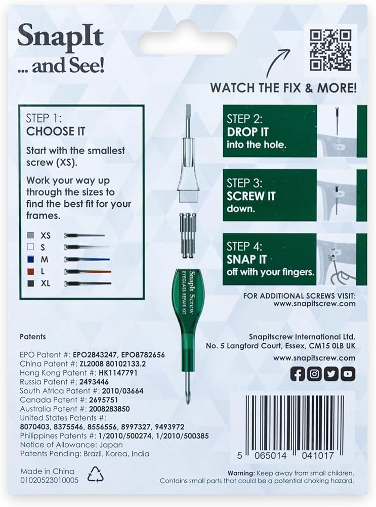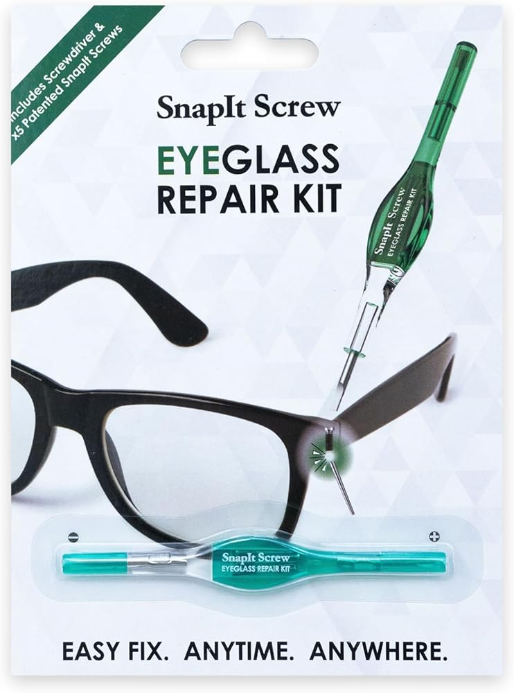 Fix your own eyeglasses in seconds! Fix your own eye-glasses in seconds with the SnapIt Screw Standard DIY Glasses Repair Kit. This compact, pocket-friendly glasses fixing kit includes a double-ended screwdriver and a choice of patented SnapIt Screws, making it the quickest and easiest way to replace lost or loose frame screws. With its extra-long feeder tip, each screw is easy to handle — simply drop it in, tighten, and snap off the tip to create a secure, lasting hold. It's the clever solution every glasses wearer should have on hand for quick, stress-free repairs. Whether you're tightening hinges on spectacles or fixing a pair of sunglasses, this handy optical repair kit keeps your eyewear in shape wherever you are. Designed to fit most frame types, it's a simple, practical must-have among your glasses accessories. Snap It, Screw It, Fix It – and see clearly again!