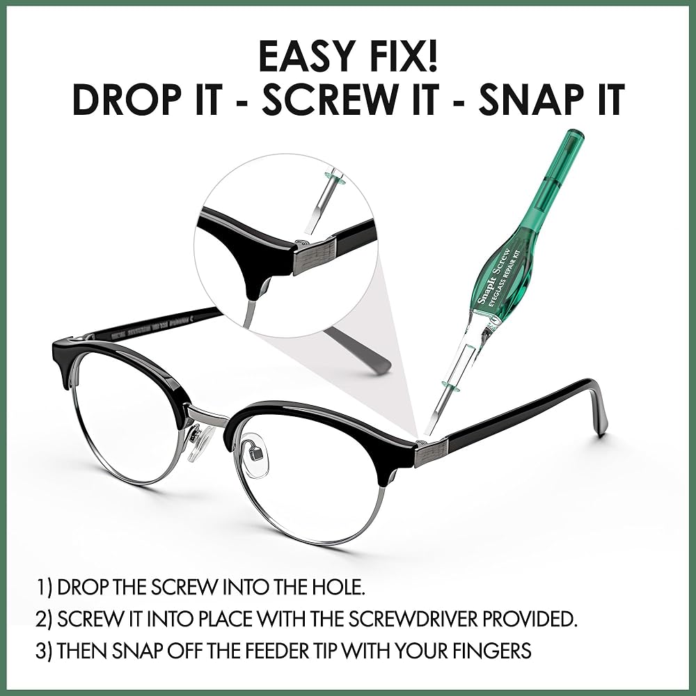 Patented Screw Design: Each glasses fixing kit with screws features the SnapIt Screw with an extra-long feeder tip for easy handling and smooth fitting.