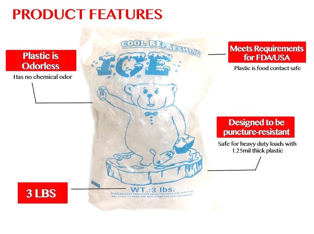 - 3lbs BPA Free, Food Grade Safe Approval Plastic Ice Bag. Save money using your own Ice Machine to bag 3 pounds of ice.