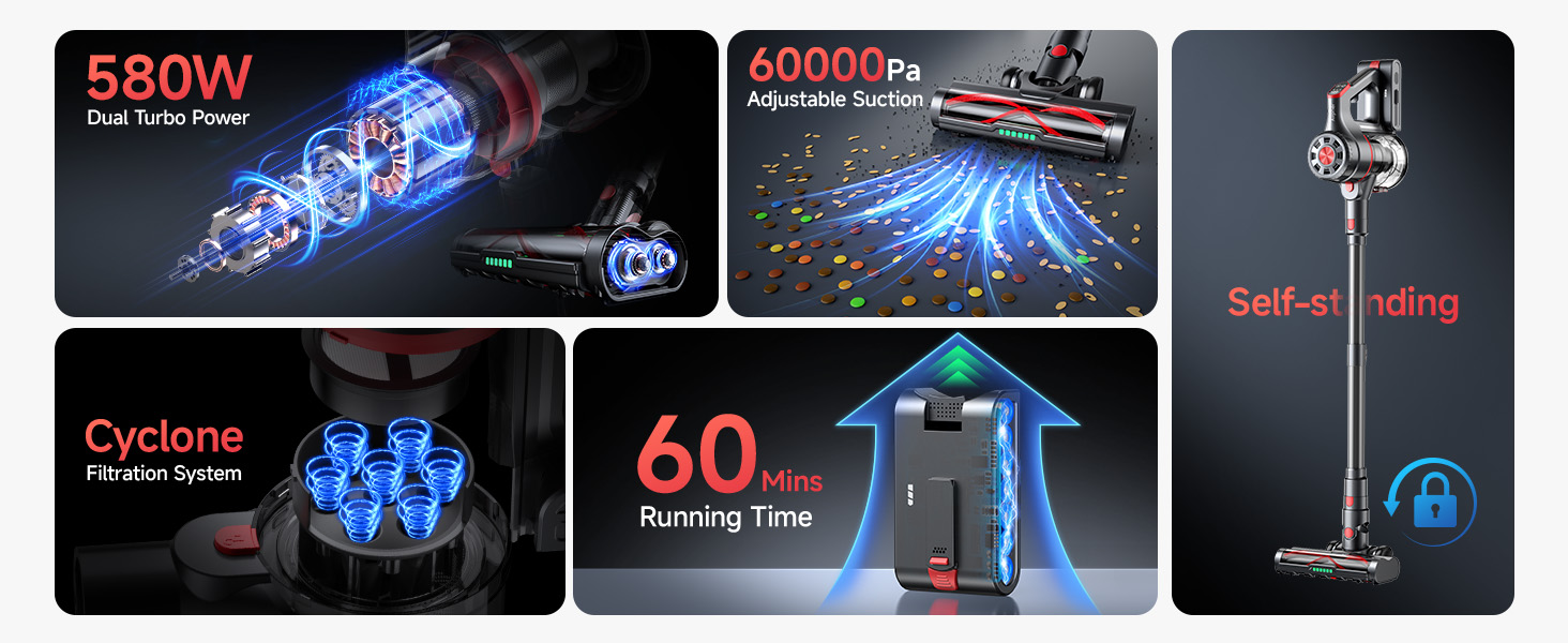 مكانس كهربائية لاسلكية للمنزل، محرك مزدوج 60 كيلو باسكال 550 وات، وقت تشغيل 60 دقيقة، كشف الطاقة وفلتر HEPA، شاشة تعمل باللمس، قائمة بذاتها لشعر الحيوانات الأليفة/السجاد/السيارة/البلاط/الأرضيات الصلبة