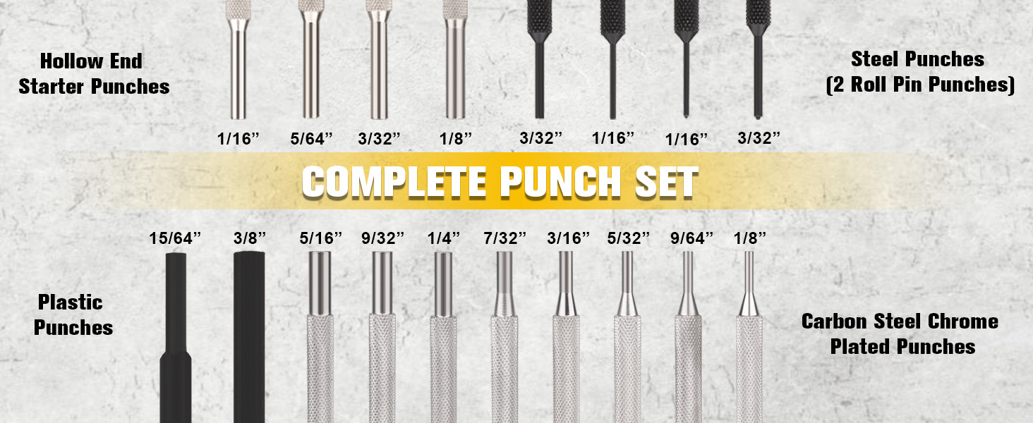 23 في 1: تتضمن مجموعة اللكمات الخاصة بنا 8 ثقوب فولاذية (1/8 بوصة، 9/64 بوصة، 5/32 بوصة، 3/16 بوصة، 7/32 بوصة، 1/4 بوصة، 9/32 بوصة و5/16 بوصة)، 2 ثقب بلاستيكي (3/8 بوصة و15/64 بوصة)، 2 ثقب دوار (1/16 بوصة و3/32 بوصة)، 4 ثقوب بداية (1/16 بوصة)، 5/64 بوصة، 3/32 بوصة و1/8 بوصة، 2 ثقب دبوس مسطح (1/16 بوصة و3/32 بوصة)، كتلة مقعد، ملقط ومطرقة مع 4 رؤوس قابلة للتبديل (فولاذ/نحاس/نايلون/مطاط). مناسبة للمعادن والخشب والجلود والحرف اليدوية
