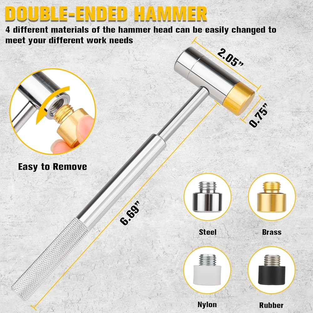 مطرقة ذكية ذات 4 رؤوس: مطرقة واحدة، أربع مواد، مرونة معززة لمختلف المهام. اختر الفولاذ لمحركات الأقراص الثقيلة، والنحاس والنايلون للأسطح الحساسة، أو المطاط لضربات خالية من الارتداد. قبضة مريحة تسمح لك بالتحكم في كل ضغطة مفتاح بدقة
