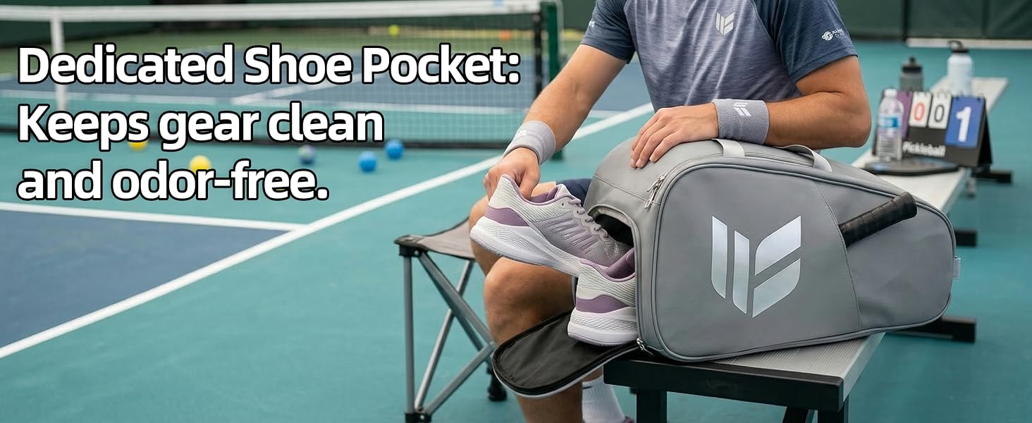 حجرة أحذية مستقلة: حافظ على ملابسك النظيفة منعشة عن طريق عزل الأحذية المتسخة. جيب الأحذية المخصص يناسب بشكل مريح زوجًا من أحذية التنس أو أحذية الملاعب للبالغين. إنها حقيبة معدات التنس المثالية للاعبين الذين يحملون معدات كثيرة لفترة طويلة.