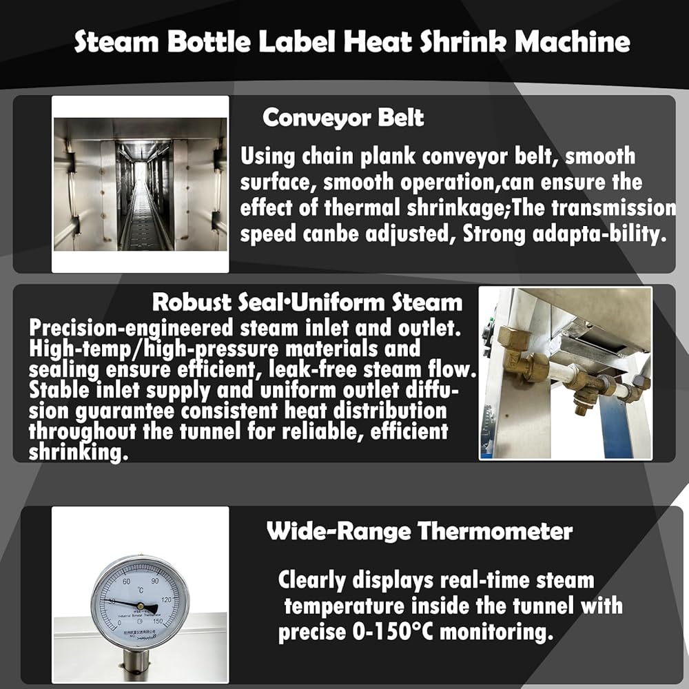 Wide-Range Thermometer: Clearly displays real-time steam temperature inside the tunnel with precise 0-150°C monitoring. Ensures accurate and controllable heat-shrink temperature for stable, efficient processing, guaranteeing optimal shrinkage results and product quality. Easy-to-read scale for instant clarity.