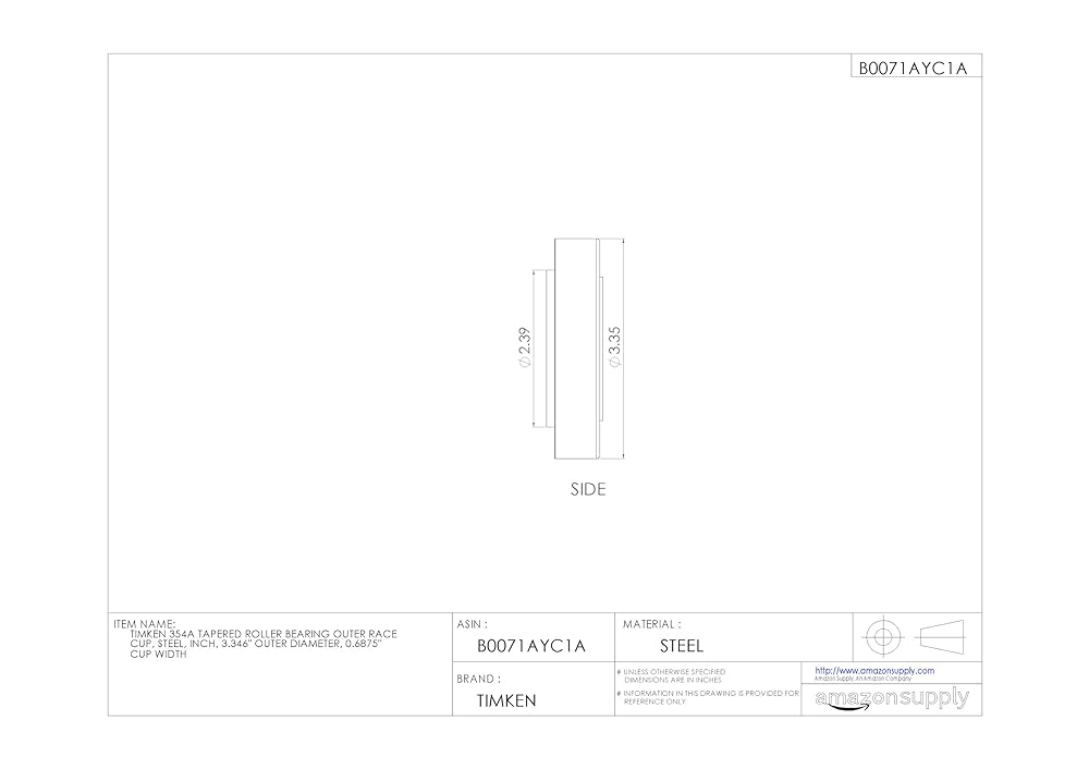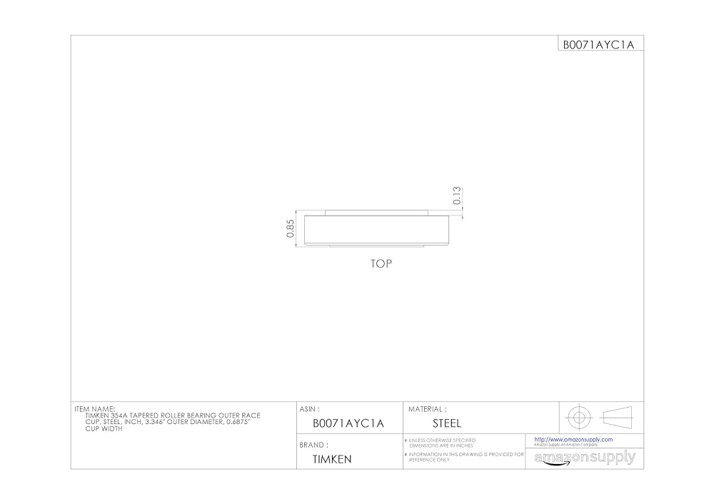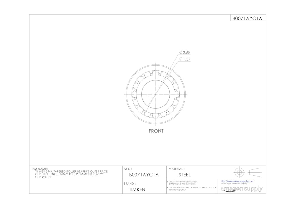 This Timken 354A single cup matches with a single cone (inner ring assembly, sold separately) to assemble into a complete single tapered roller bearing, suitable for applications that support both radial and axial loads. This cup is matched to its cone assembly based on the load that the bearing needs to support, and if the bearing needs radial internal clearance to accommodate thermal expansion. Generally mounted in opposing pairs on a shaft to evenly distribute loads, this single tapered roller bearing assembly is stable in temperatures ranging from -54 to 120 degrees C (-65 to 250 degrees F). The single cup is made of Timken's high-alloy steel for durability, heat tolerance, and resistance to deformity under heavy loads. As part of a separable tapered roller bearing unit, this single cup has an open design that allows for lubrication and accurate adjustments. This single tapered roller bearing is for use in high-load, moderate-speed applications that include automotive axle systems and conveyor systems in heavy duty industries such as mining, construction and agriculture, among others.