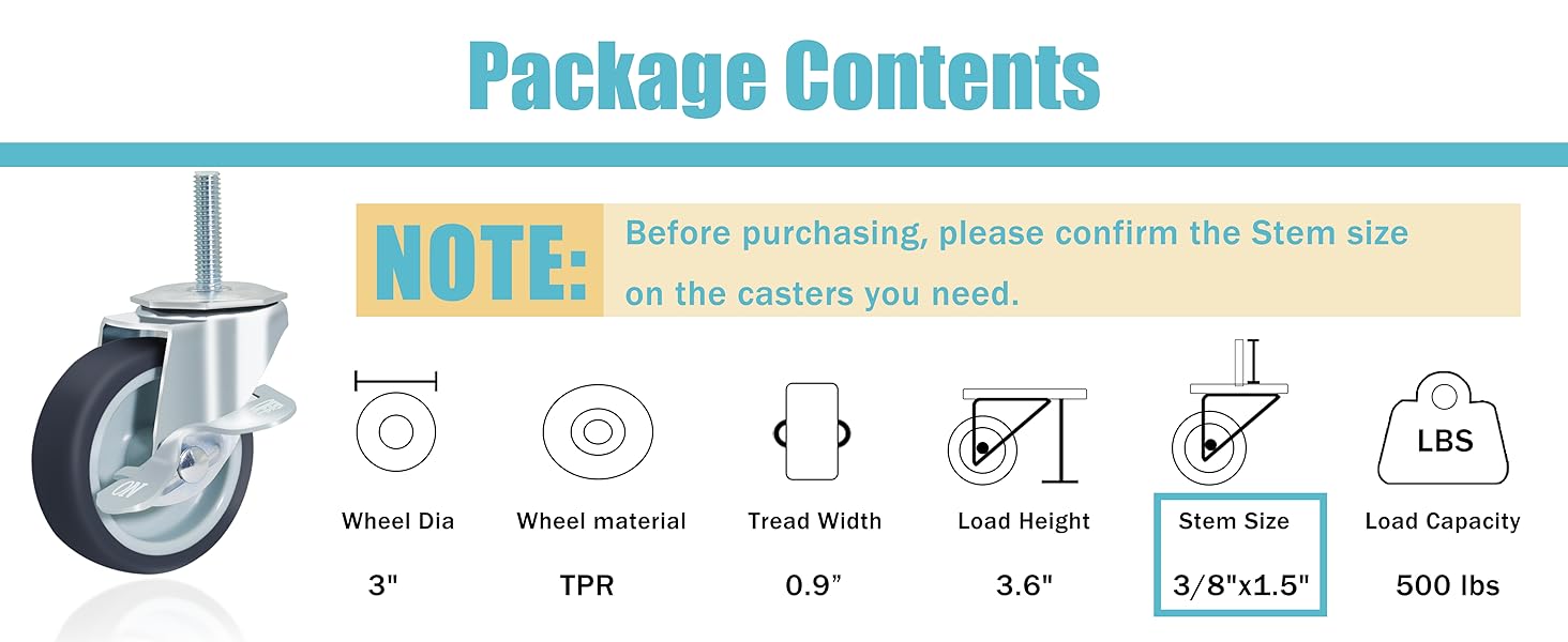 【أبعاد الجذع الملولب】 3/8 بوصة - 16UNC × 1-1/2 بوصة (قطر الجذع الملولب 3/8 بوصة، طول الجذع 1-1/2 بوصة) عجلات جذعية ملولبة. قبل الشراء، يرجى التأكد من أبعاد الجذع مرة أخرى.