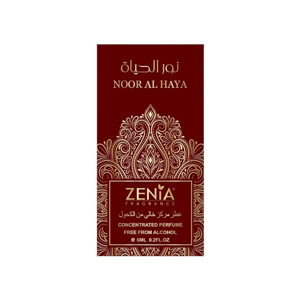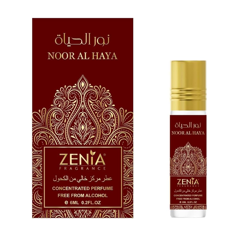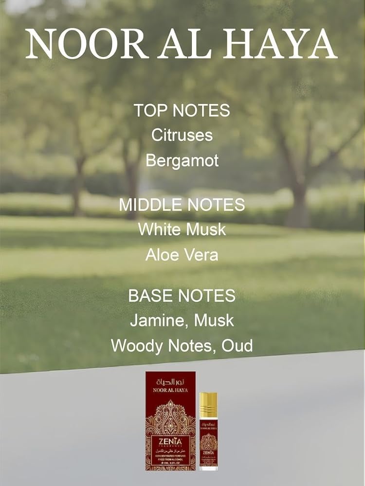 Noor Al Haya - 6ml (.2 oz) Perfume Oil Roll-On by ZENIA Noor Al Haya Perfume Oil is a radiant blend of freshness and depth—crafted for those who embody grace and quiet strength. This roll-on oil delivers a smooth, long-lasting fragrance that feels both luminous and grounding. Top Notes: Bright Citruses and crisp Bergamot open the scent with a refreshing spark full of energy and light. Middle Notes: The heart reveals the soft elegance of White Musk paired with the clean, cooling touch of Aloe Vera, adding purity and serenity. Base Notes: Finally, Jasmine, Musk, Woody Notes, and Oud create a sensual and timeless foundation—floral, musky, and richly layered. Noor Al Haya Perfume Oil is perfect for those who seek a scent that is fresh yet enduring—refined, graceful, and deeply captivating.