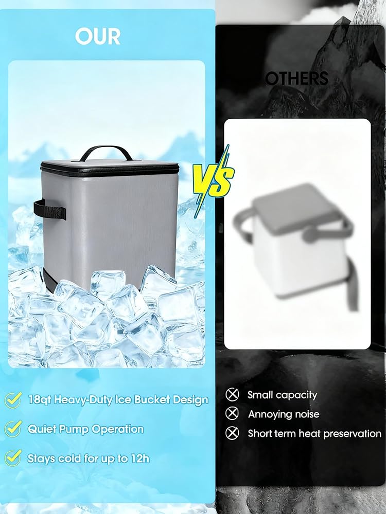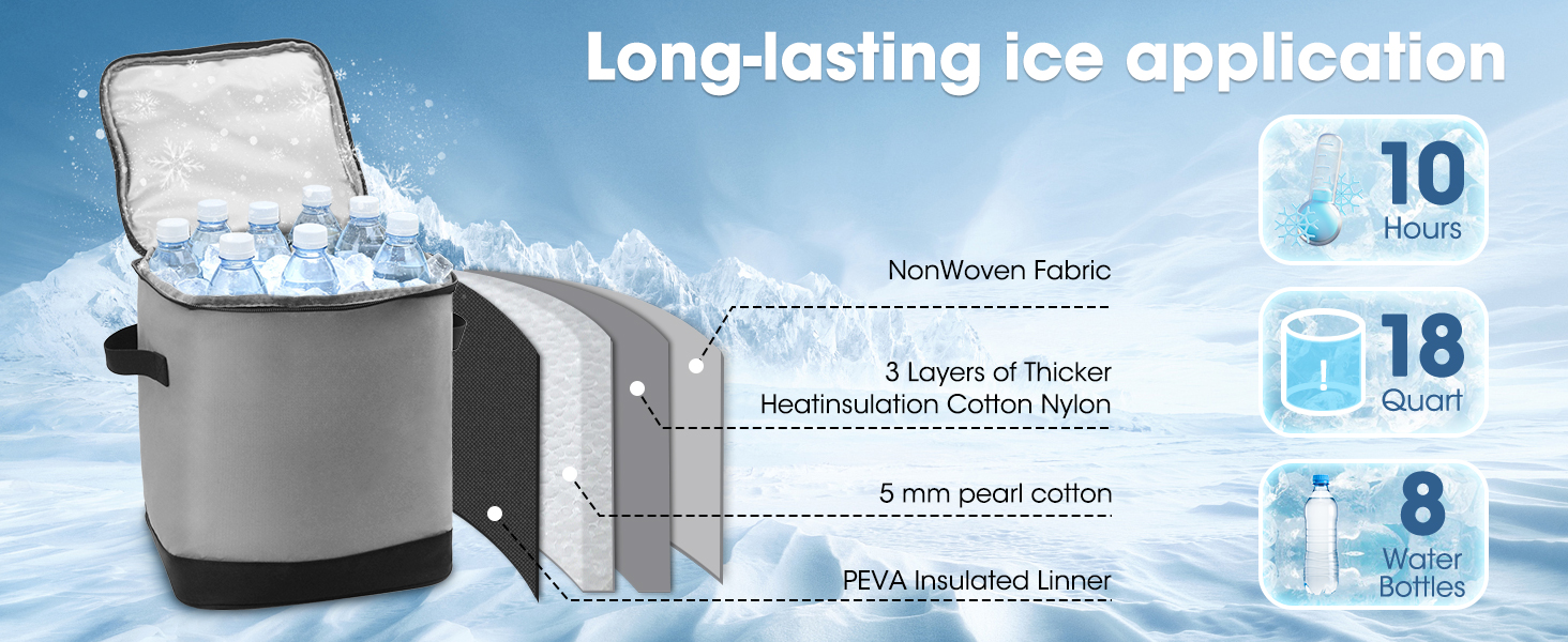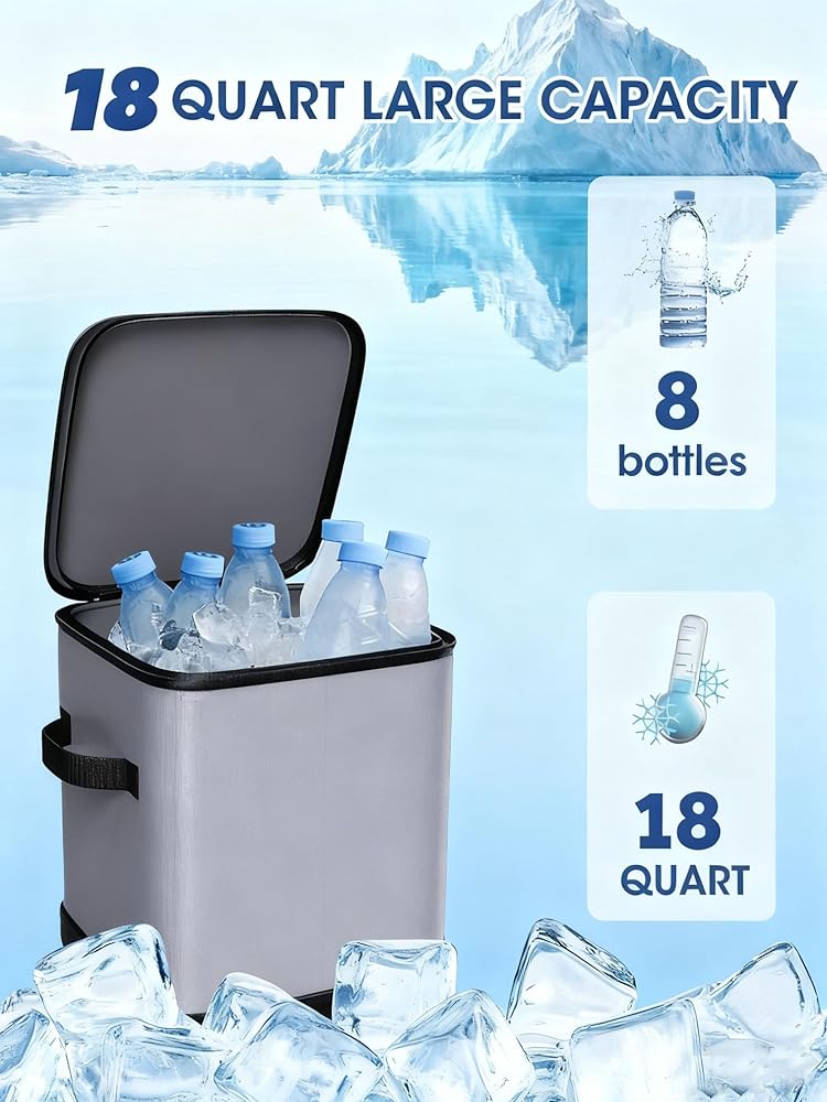 تصميم معزول عالي السعة: يحتوي الدلو المعزول بسعة 18 لترًا على ثماني زجاجات مياه مجمدة، مما يوفر أكثر من 12 ساعة من العلاج البارد المستمر. بفضل العزل السميك وقابلية النقل القابلة للطي، فإنه يحافظ على درجة الحرارة المثالية لجلسات التعافي الممتدة