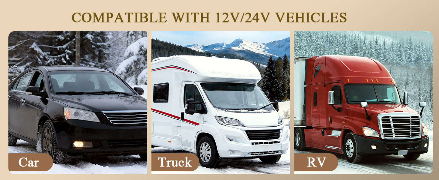 ملاءمة عالمية 12 فولت/24 فولت مع سلك طويل 7.8 قدم - راحة المقعد الأمامي والخلفي - يعمل بسلاسة مع الشاحنات وشبه الشاحنات ومركبات RV وسيارات الدفع الرباعي والسيارات - متوافق مع Freightliner وKenworth وPeterbilt وFord F-150 وRam 1500 وChevrolet Silverado وToyota Tacoma ومعظم المركبات على الطريق. يصل سلك الطاقة الطويل للغاية الذي يبلغ 7.8 قدم (2.4 متر) من منفذ 12 فولت/24 فولت إلى المقاعد الأمامية والخلفية، بحيث يمكن للركاب الاستمتاع بالدفء أيضًا. سواء كنت سائق شاحنة OTR أو عائلة في رحلة على الطريق، سيظل الجميع دافئًا ومرتاحًا.