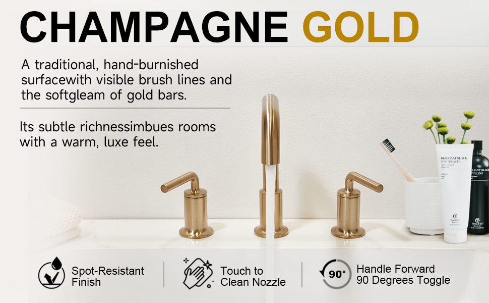 لمسة نهائية أنيقة - صنبور الحمام الذهبي الشمبانيا مطلي بطبقة نهائية مصقولة بطبقات متعددة لمقاومة بقع الماء وبصمات الأصابع، مما يتطلب تنظيفًا أقل. عملية حصرية مصقولة يدويًا تمنح هذا اللمسة النهائية الدافئة بريقًا مخمليًا بدرجات ذهبية داكنة بمهارة. إنه يكتسب تأثيرًا موروثًا يانعًا، بعد أن كان له السبق في عملية الملكية الخاصة بنا