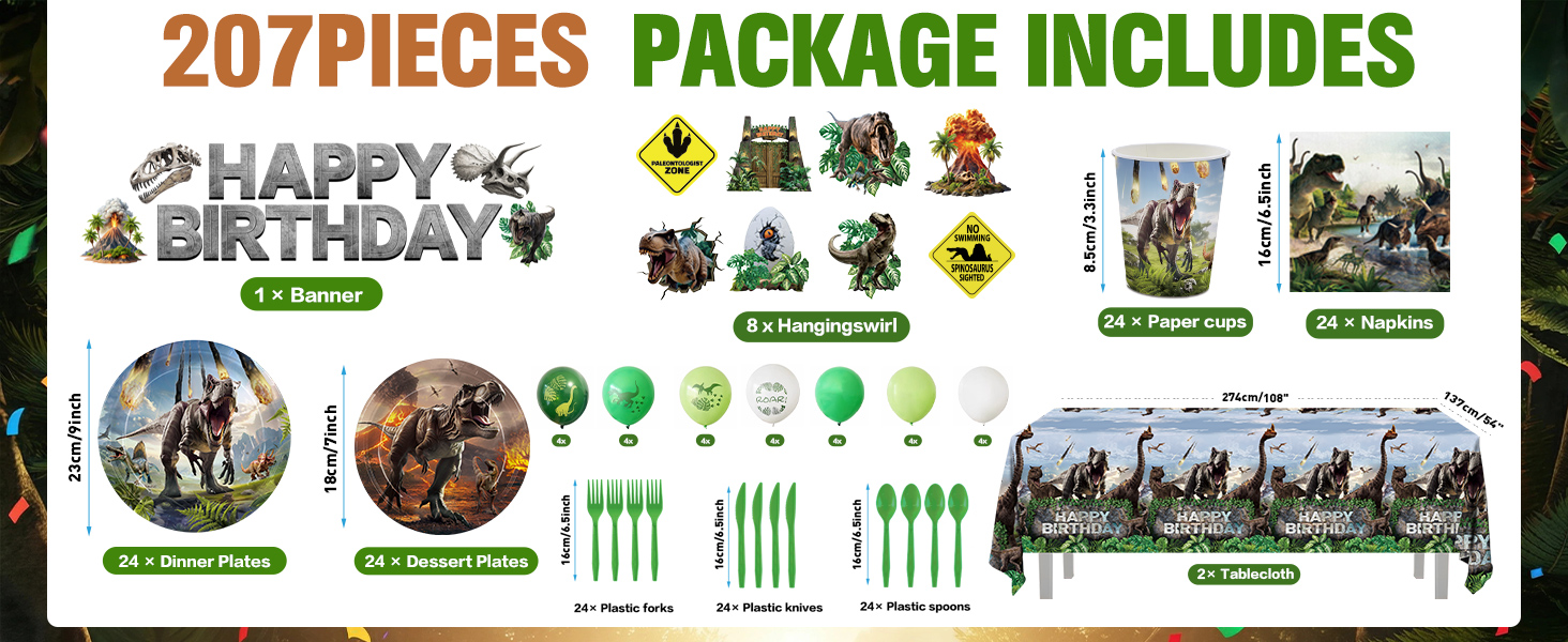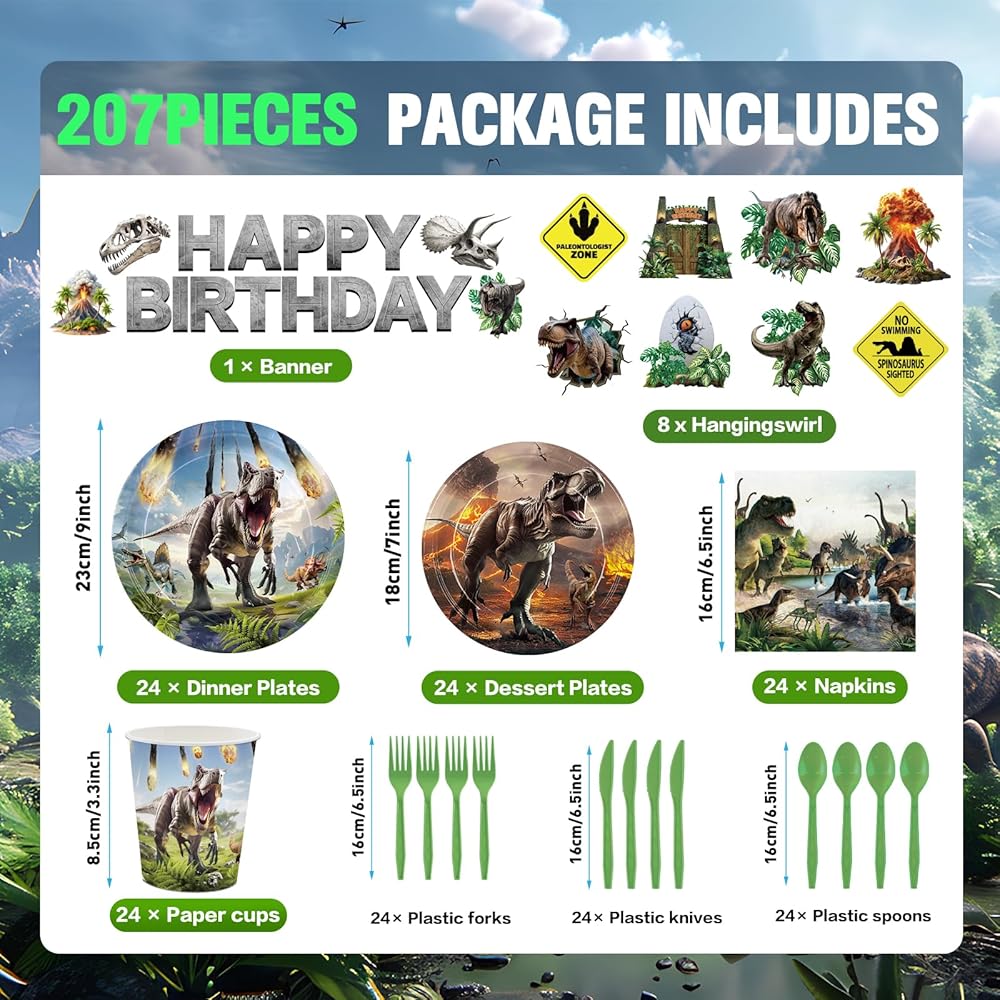 207 قطعة من أطباق زينة حفلات الديناصورات والمناديل ومستلزمات أعياد الميلاد من دينو وورلد تتضمن مجموعة أدوات المائدة أطباق ومناديل وأكواب وأدوات مائدة وبالون ولافتة ودوامة معلقة ومفرش طاولة لديكور الحفلات يخدم 24 شخصًا