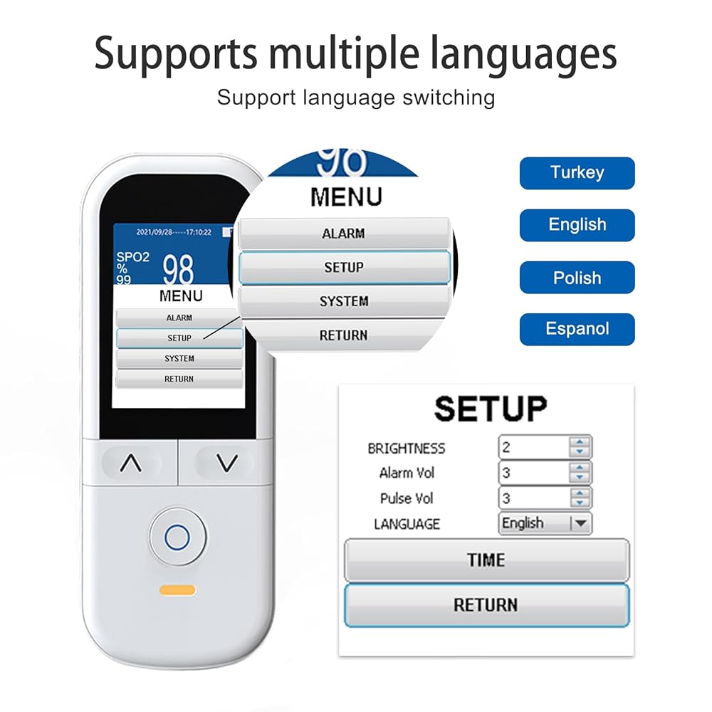 تخزين قوي للبيانات: يحتوي طرف إصبع جهاز مراقبة الأكسجين للأطفال على 500 مجموعة بيانات مع سجلات مراقبة مستمرة لمدة 20 ساعة لكل مريض. التحقق بسهولة من القراءات التاريخية. مقياس التأكسج المحمول للأطفال يدعم متعدد اللغات (EN/ES/TR/PL) يعزز سهولة الاستخدام.