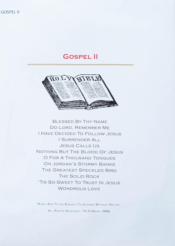 Song List: Blessed Be The Name, Do Lord Remember, I Have Decided To Follow Jesus, I Surrender All, Jesus Calls Us, Nothing But The Blood Of Jesus, O For A Thousand Tongues, On Jordan's Stormy Banks, The Great Speckled Bird, The Solid Rock, 'Tis So Sweet To Trust In Jesus, Wondrous Love