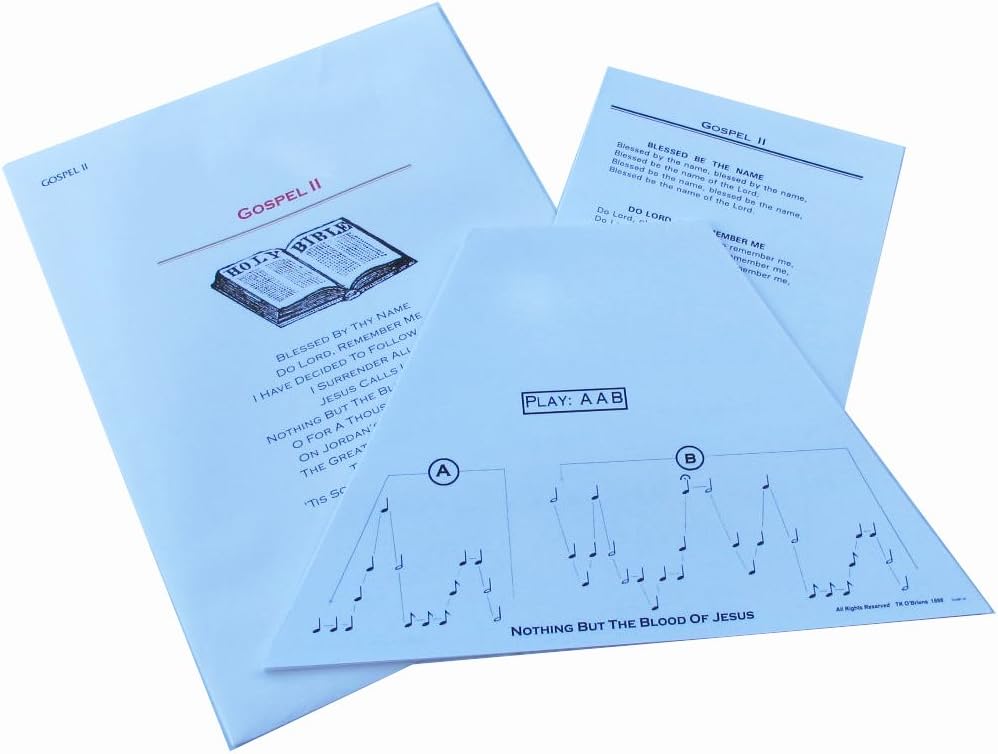 This lap harp music is designed for TK O'Brien's Standard, Deluxe and Custom Lap Harps. It does NOT fit First Act, Music Maker or Melody Harp. The songs are in the key of G and show the note values so when you play the song you pluck the string where you see the note and follow the connecting lines. As simple as that! Having the actual note to look at helps if you want to learn to read standard music notation and helps you with timing for playing the song. For songs that have multiple verses you repeat at the start. Some songs may have specific playing instructions. Sheet of words to the songs included where applicable. The song cards measure 4 1/2 inches at the top, 12 inches at the bottom, and 7 5/8 inches from top to bottom.