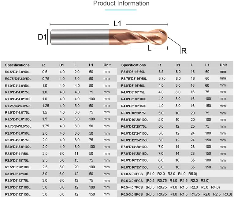 1XCAN 2 Flute Ball Nose End Mill R0.5-R8.0 Carbide Milling Cutter TiCN Coated Radius Router Bit