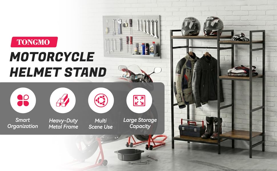 🏍رف احترافي لمعدات الدراجات النارية للراكبين يوميًا، تم تصميم رف تروس الدراجات النارية TONGMO لتنظيم إعداد الركوب الكامل في مكان واحد. تم تصميمه كحامل خوذة دراجة نارية ثابت ومتين، فهو يحافظ على الخوذ والسترات والأحذية مخزنة بشكل صحيح وجاهز دائمًا لرحلتك القادمة.