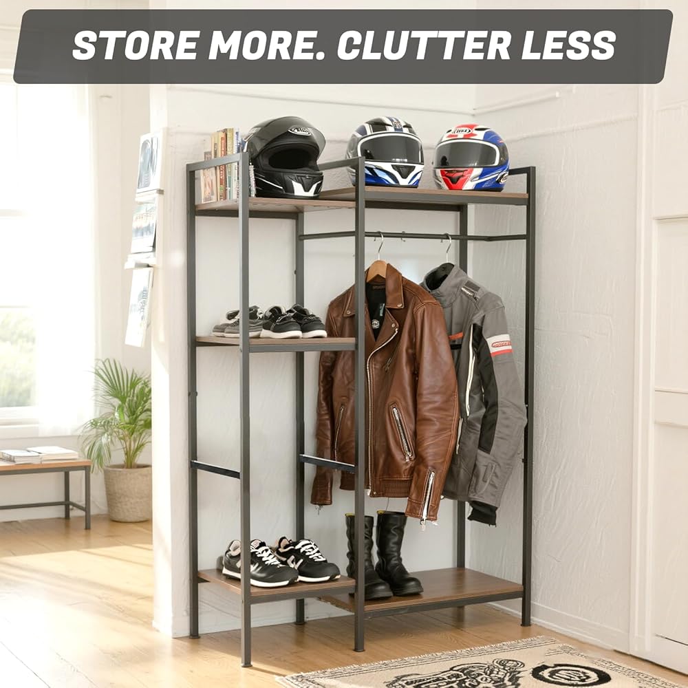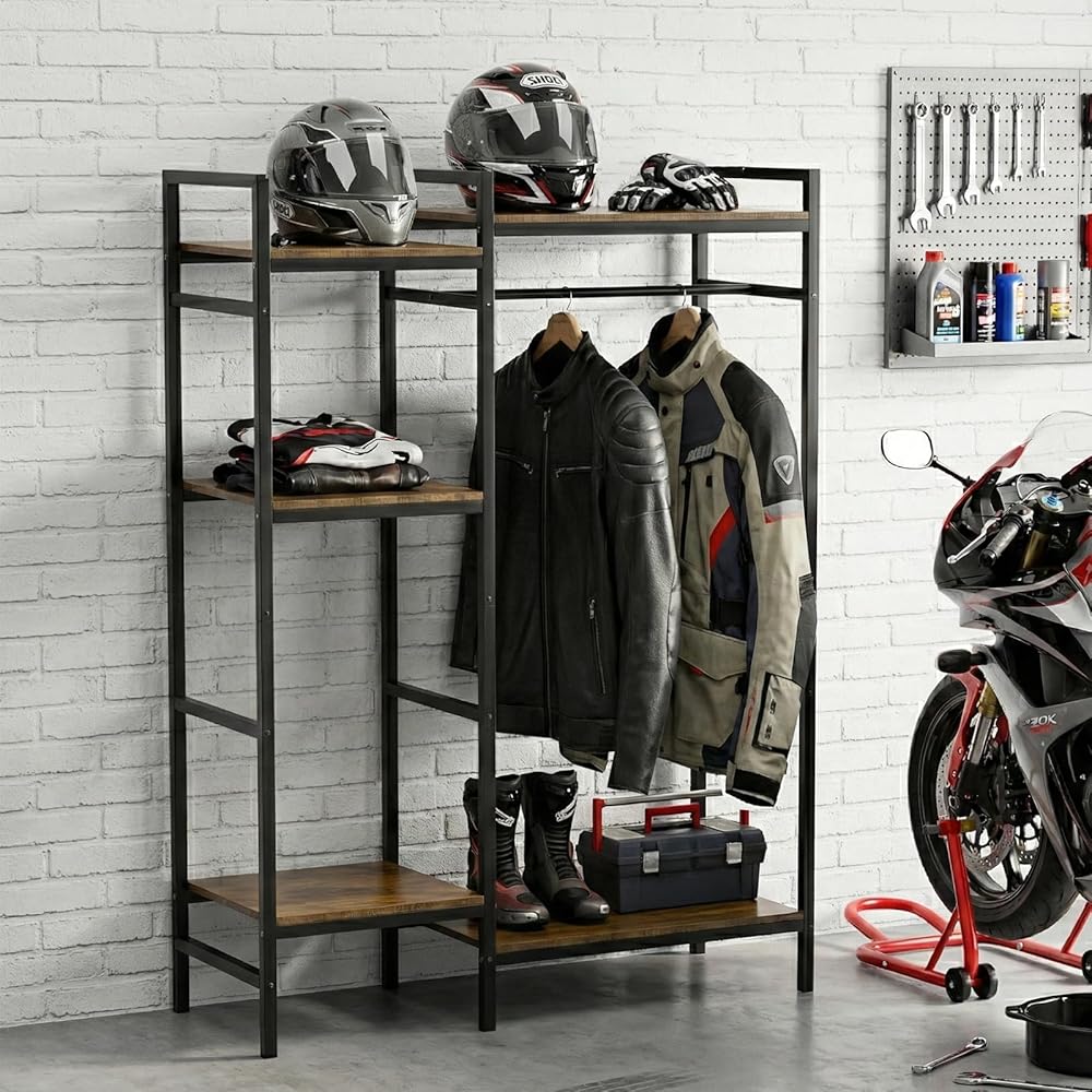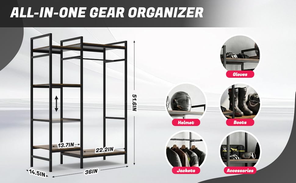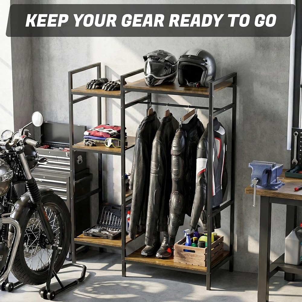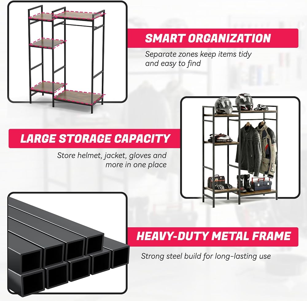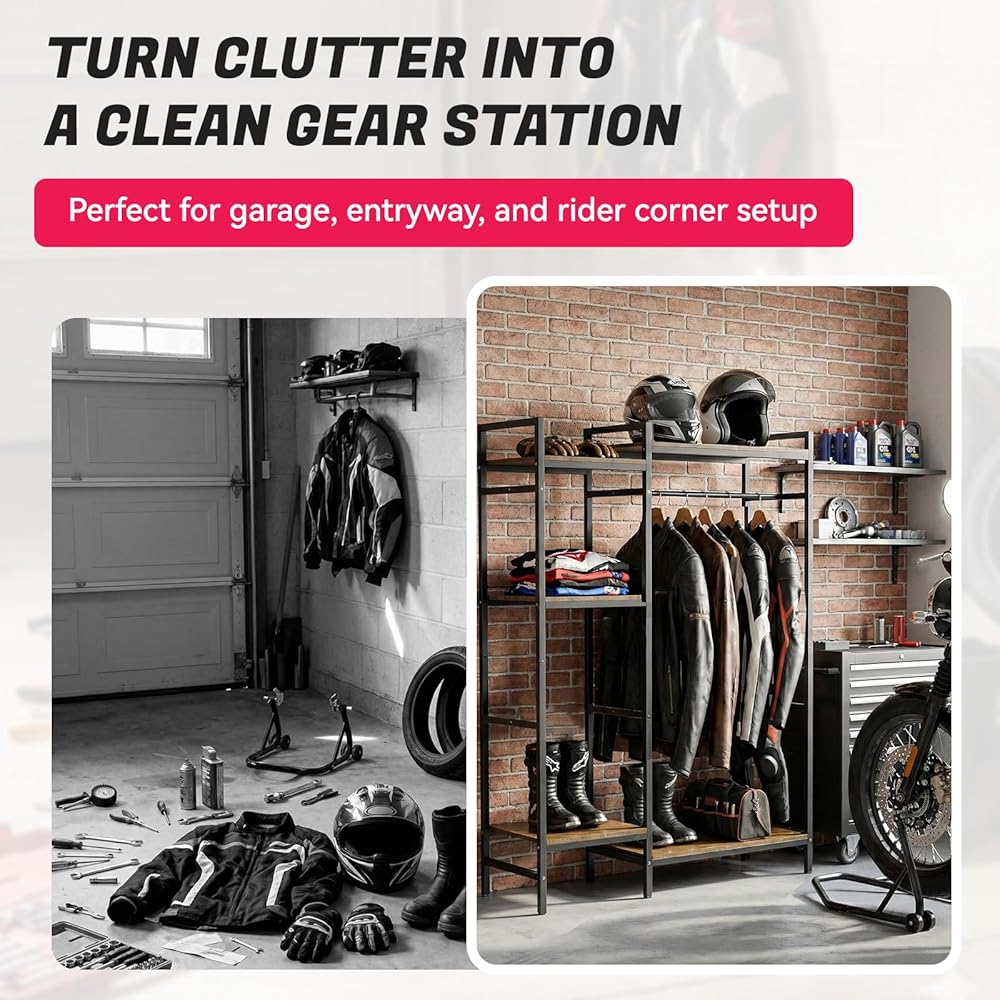 🏗 حل رف معدات الدراجات النارية الكل في واحد على عكس الحوامل البسيطة، يجمع رف تخزين معدات الدراجات النارية هذا بين وضع الخوذة ومساحة التعليق وتخزين الرف. يساعد حامل خوذة الدراجة النارية الصلب على التخلص من الفوضى وتركيز جميع أساسيات الركوب.