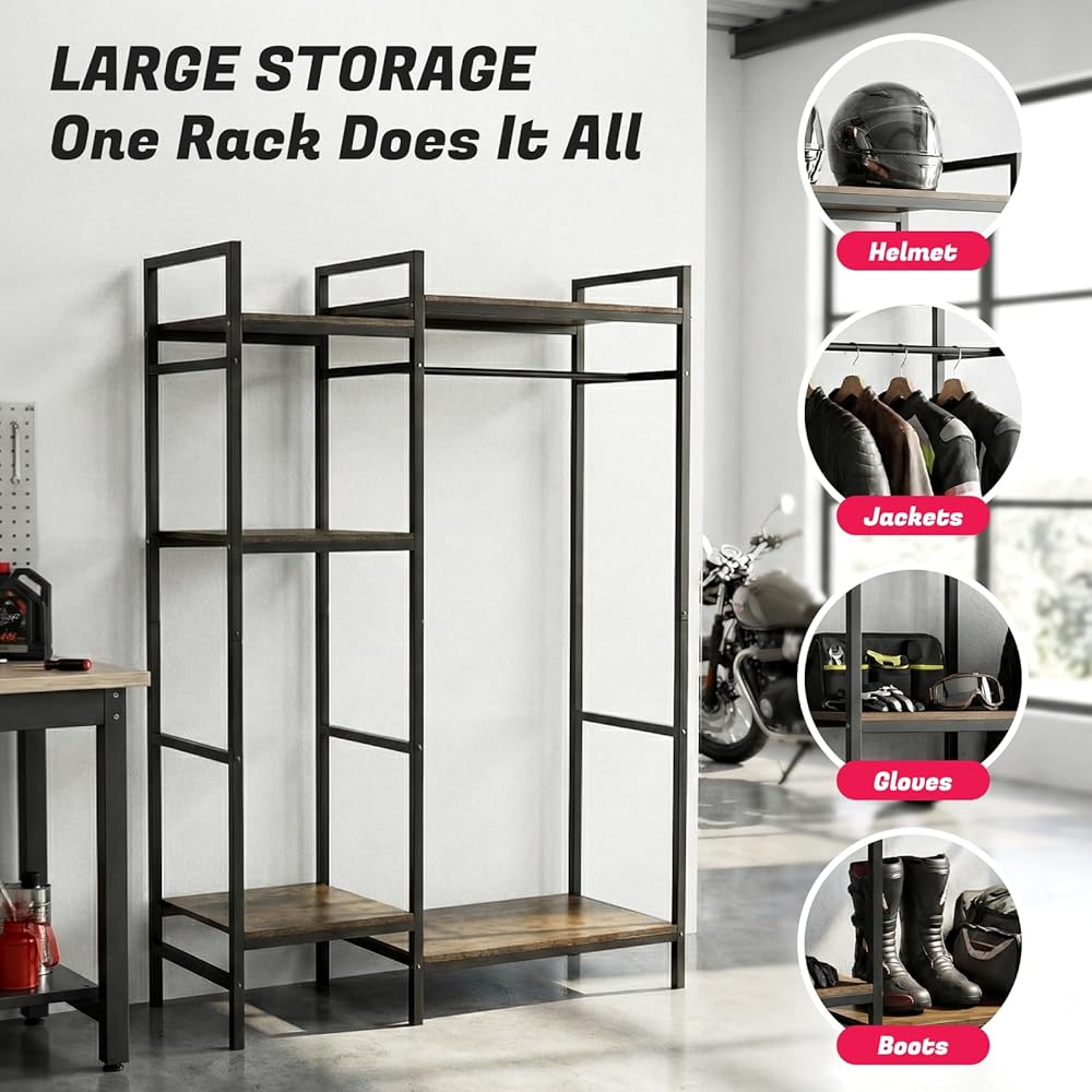💪 هيكل رف تخزين معدات الدراجات النارية عالي التحمل مصنوع من معدن مقوى سميك، رف تخزين معدات الدراجات النارية هذا يدعم معدات الركوب الثقيلة بثبات. سواء كنت تحمل خوذات أو سترات معلقة، فإن رف معدات الدراجات النارية هذا يحافظ على التوازن دون الانحناء أو الاهتزاز.