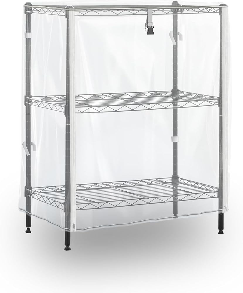 • غطاء الرف فقط - يرجى التحقق من أن أرفف التخزين الثلاثة الخاصة بك يبلغ مقاسها 60.96 سم عرضًا × 35.56 سم عمقًا × 76.2 سم ارتفاعًا قبل الشراء. تم تصميم هذا الغطاء ليناسب أرفف تخزين الأسلاك الفولاذية حتى هذا الحجم