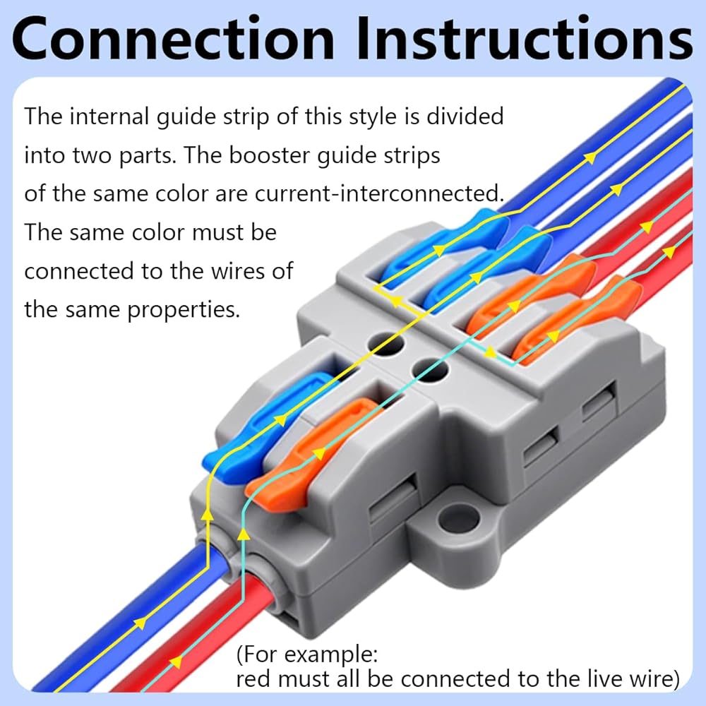✔️أسلاك خارجية مبسطة ثنائية في أربعة: قم بتبسيط التوصيلات باستخدام هذه الكتل الطرفية البديهية ذات الرافعة 2 في 4 خارج. قم بتفرع خطوط الإدخال المزدوجة بكفاءة إلى أربعة خطوط إخراج، مما يتيح توصيل الأسلاك بسرعة وآمنة وخالية من الأدوات للمشروعات التي تتطلب أربع نقاط توزيع.