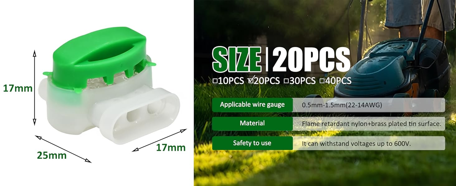 • ما ستحصل عليه: 20 قطعة من موصلات الأسلاك ذاتية التعرية (2.5 × 1.7 × 1.7 سم / الطول × العرض × الارتفاع)، مصممة للتوصيلات السريعة والموثوقة لأسلاك 22-14 AWG.