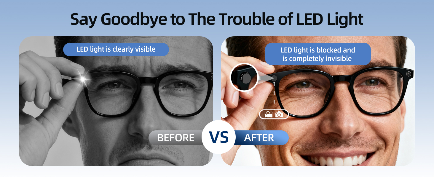 الاختلافات في الاستخدام في ظل بيئات الإضاءة المختلفة: 1. البيئات النهارية أو البيئات جيدة الإضاءة: احتفظ بالغطاء العلوي لحاجب ضوء LED مغلقًا. سيظل مؤشر LED الأمامي مخفيًا عن أعين الآخرين. 2. أثناء الليل أو ظروف الإضاءة المنخفضة (بما في ذلك عندما ترى المطالبة "تم حظر LED"): افتح الغطاء العلوي لحاجب ضوء LED لكشف مدخل الضوء الأمامي حتى تتمكن النظارات من التقاط الصور أو تسجيل مقاطع الفيديو بشكل صحيح. في هذه الحالة، سيكون مؤشر LED الأمامي مرئيًا للآخرين.