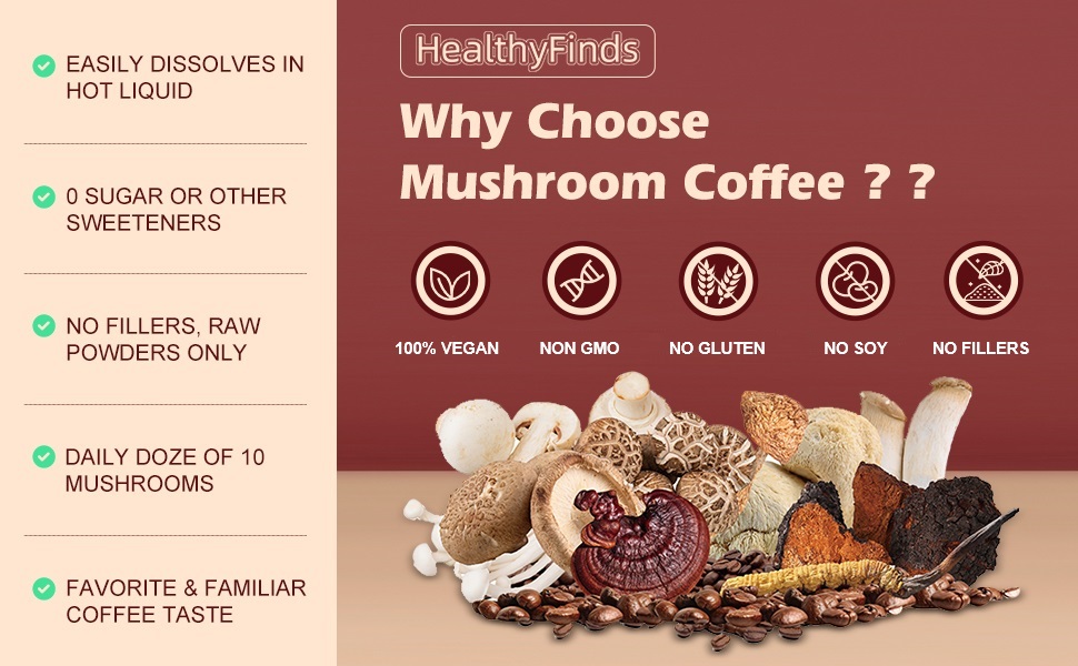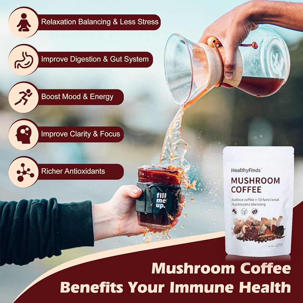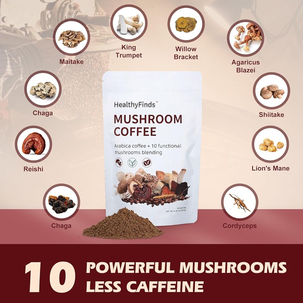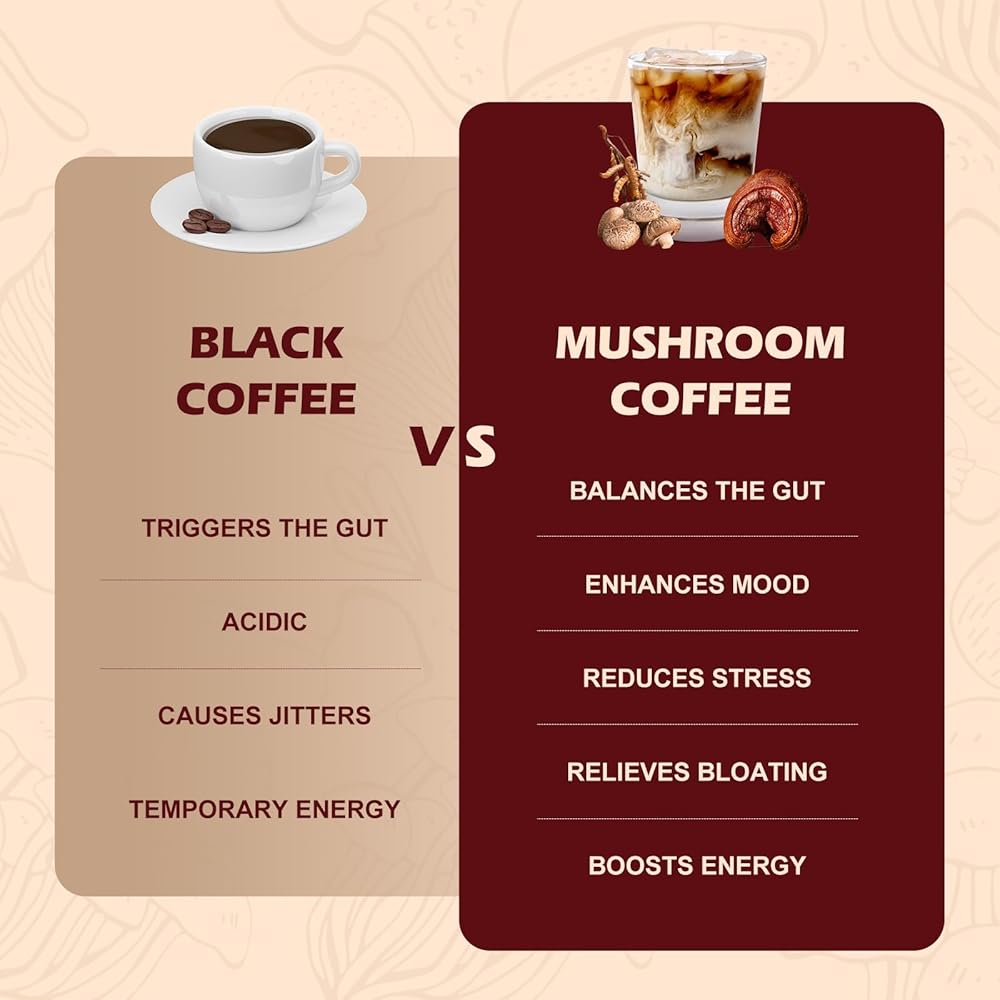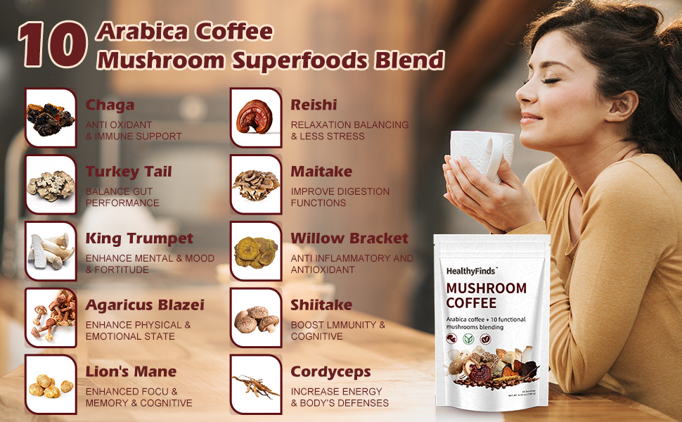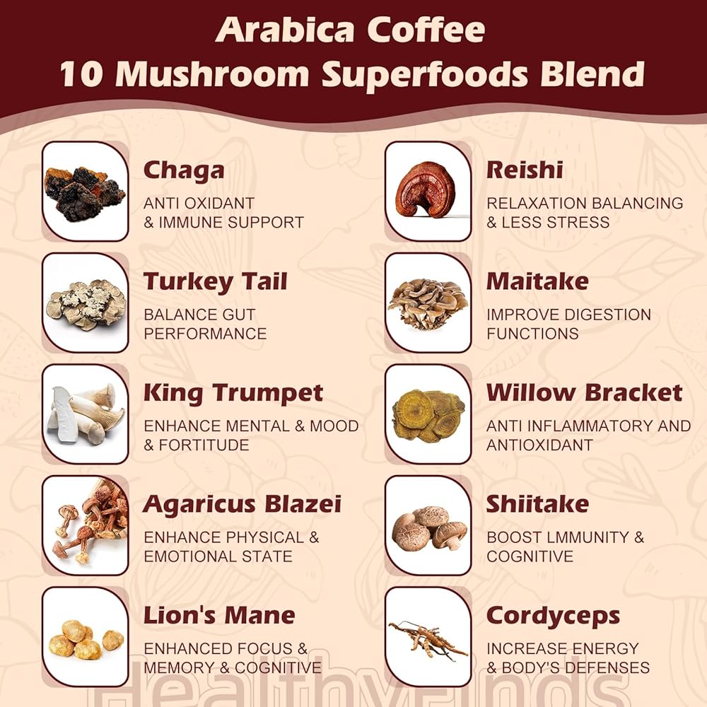 مزيج القهوة العشرة للفطر: قهوة الفطر مصنوعة من خلال الجمع بين القهوة الفورية مع الفطر المجفف والمطحون جيدًا، وتتميز بـ 10 فطر فاخر، بما في ذلك عرف الأسد، والريشي، والكورديسيبس، والشيتاكي، وكينج ترومبيت، وذيل الديك الرومي، والمايتاكي، ويلو براكيت، وأجاريكوس بلازي وشاجا، بالإضافة إلى زيت MCT وحليب جوز الهند وحبوب القهوة العربية العضوية، أفضل للتركيز والطاقة وصحة الهضم ودعم المناعة.