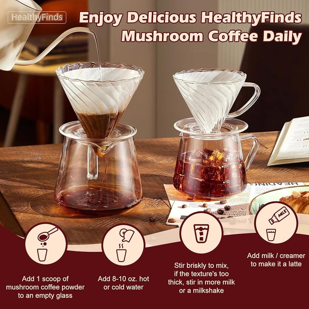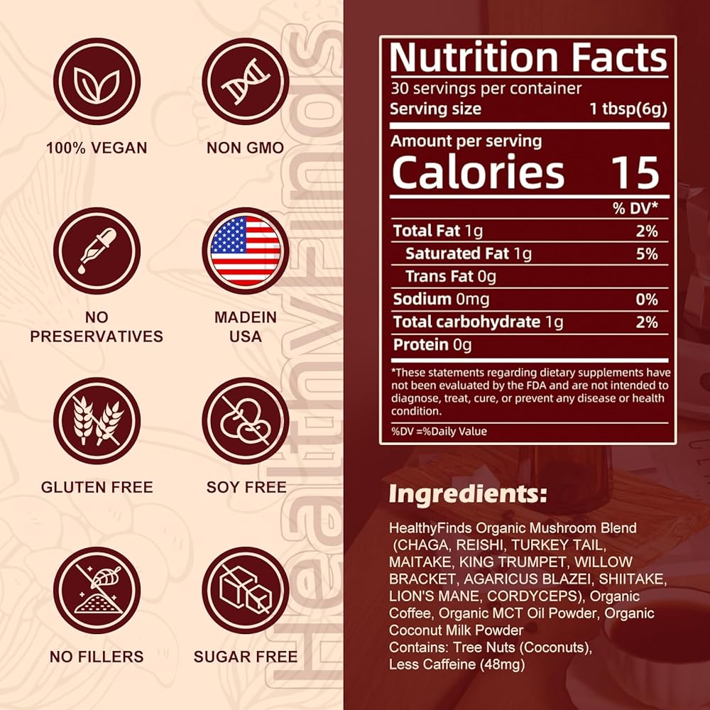 سهلة التحضير: شكل قهوة الفطر HealthyFinds هو مسحوق قهوة الفطر الفوري، فقط تناول ملعقة كبيرة (6 جم) من القهوة لكل 8-10 أونصة سائلة. أونصة، أضف كريمة أو حليب حسب تفضيلاتك؛ إذا كنت تحب الثلج أو القهوة الساخنة، أضف أيضًا مكعبات الثلج أو قم بتحضيرها بالماء الساخن. مكونات الفطر الطبيعية مناسبة جدًا للنباتيين