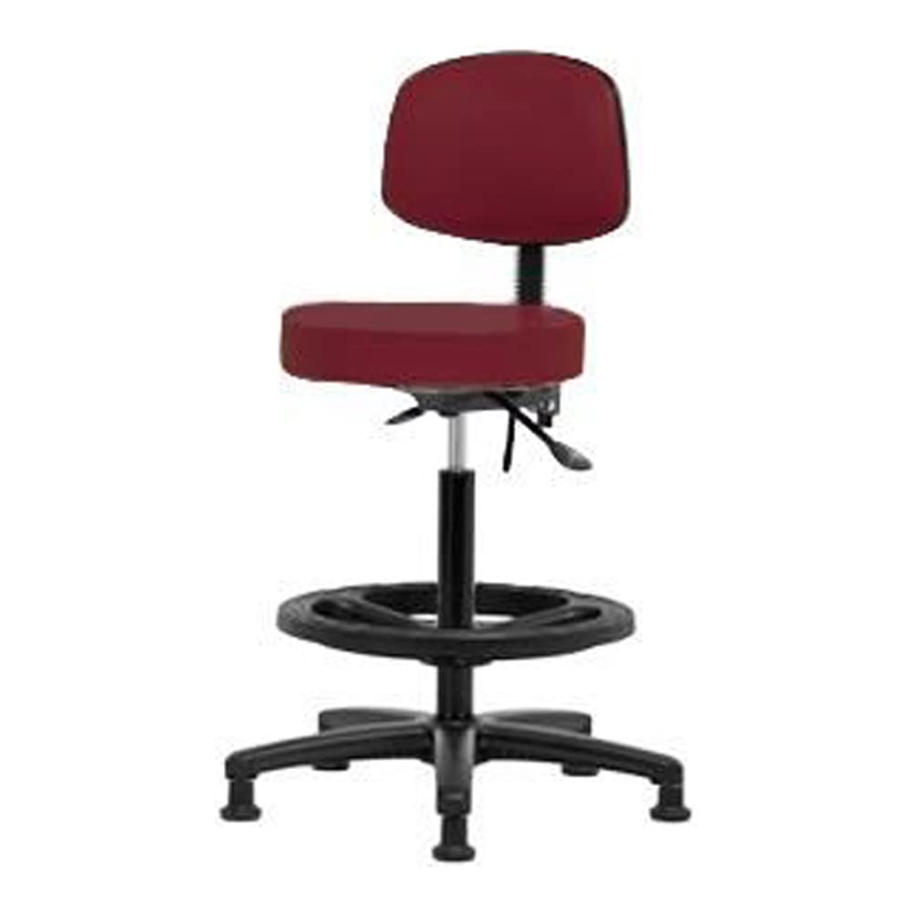 The product Type is vinyl high Bench height stool with back and black nylon base, with tilt, black foot ring, glides, Navy. Country of origin is United States, manufacturer of this product is Thomas.
