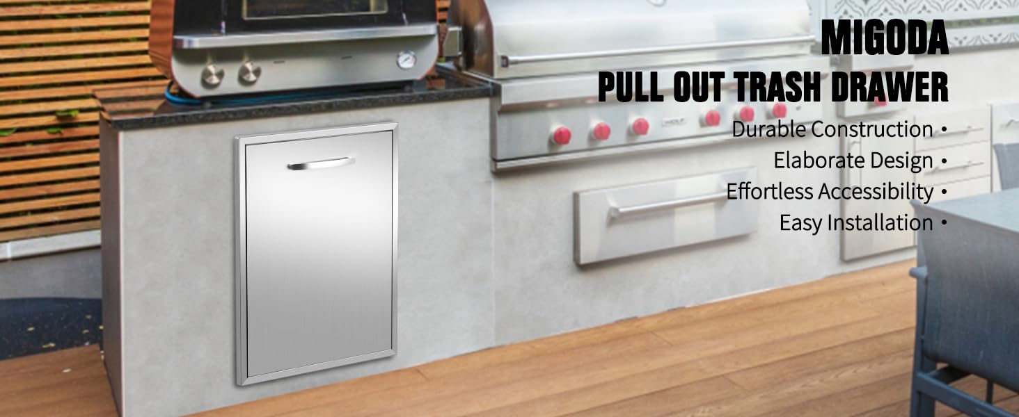 هيكل متين: تم تصميم سلة المهملات المصنوعة من الفولاذ المقاوم للصدأ القابلة للسحب لتحمل البيئات القاسية في مطبخك الخارجي. مصنوعة من الفولاذ المقاوم للصدأ 304، وهو مقاوم للتآكل والخدش، ويضمن استخدامًا طويل الأمد للأنشطة الخارجية مثل سلة المهملات للشواء في الهواء الطلق.