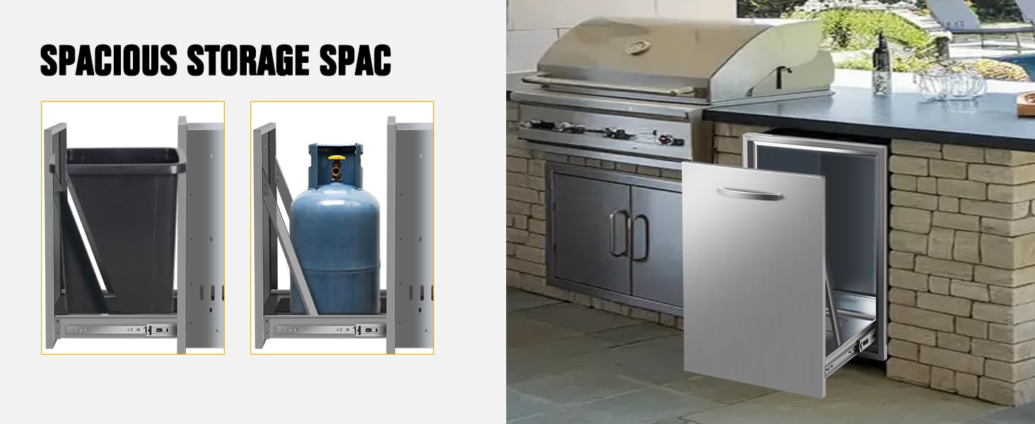 استخدام واسع: درج القمامة المزدوج المدمج الخاص بنا القابل للسحب للمطبخ الخارجي، يعد تخزين درج القمامة المصنوع من الفولاذ المقاوم للصدأ مثاليًا للأنشطة الخارجية مثل محطة شواء جزيرة الشواء. توفر مساحة كبيرة للتخلص من النفايات، ويمكن استخدامها كدرج قمامة للمطبخ الخارجي.
