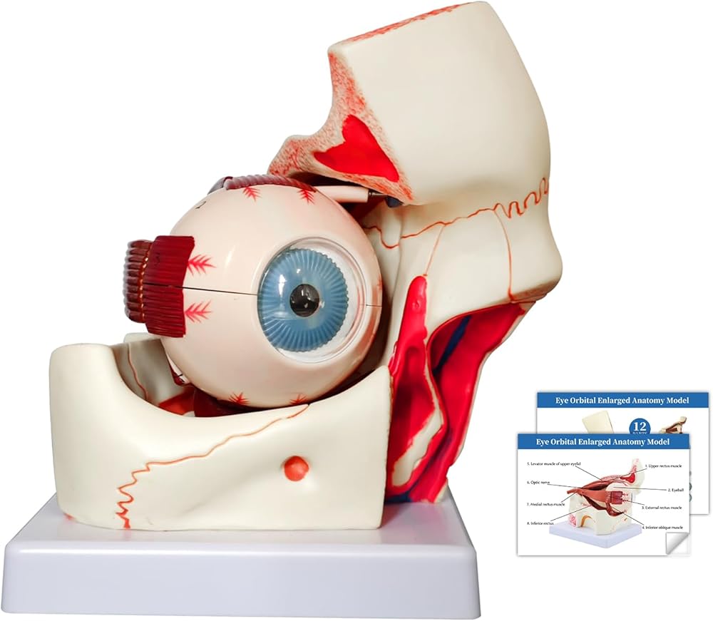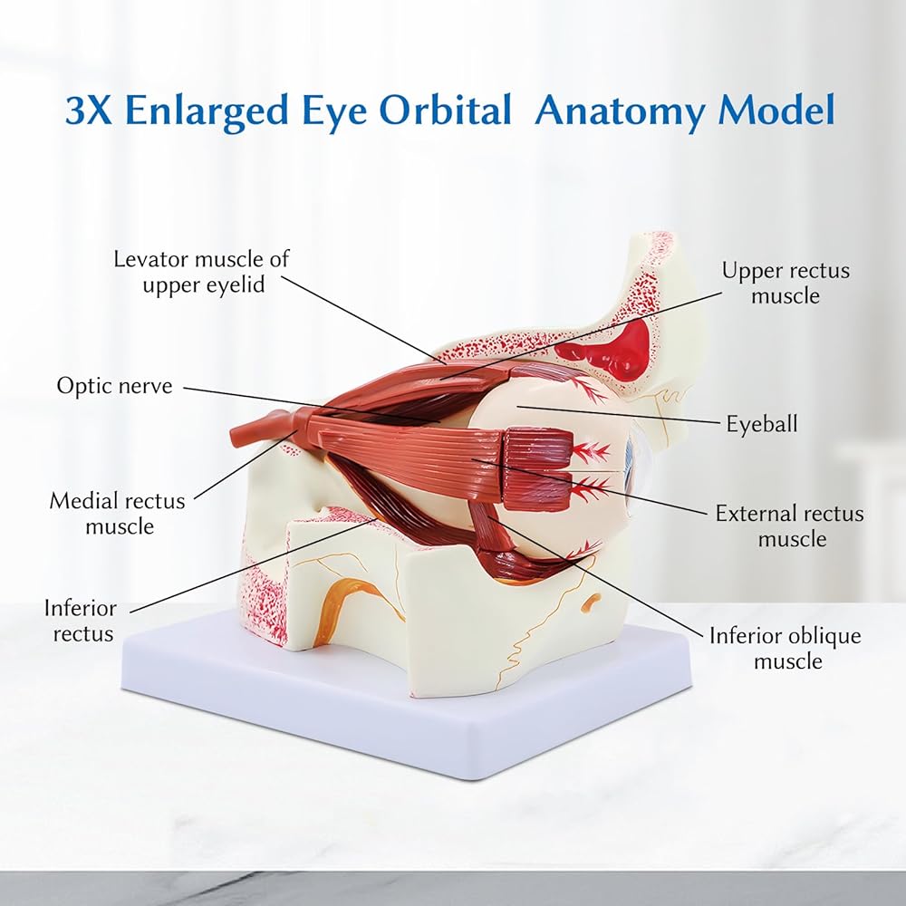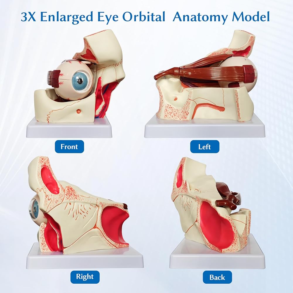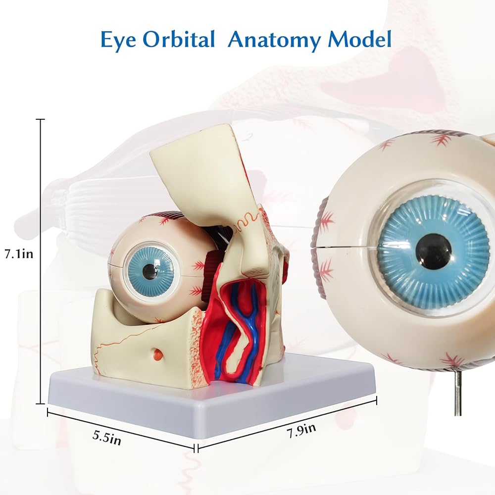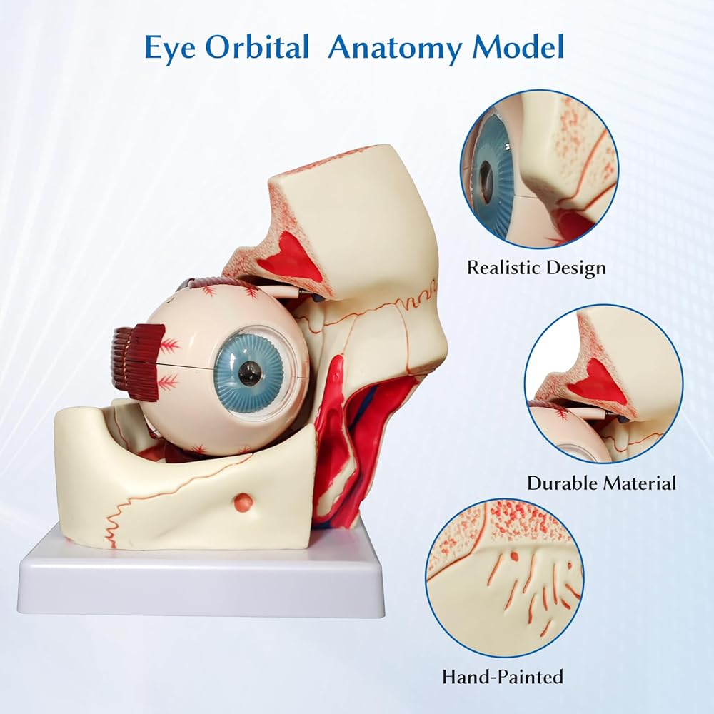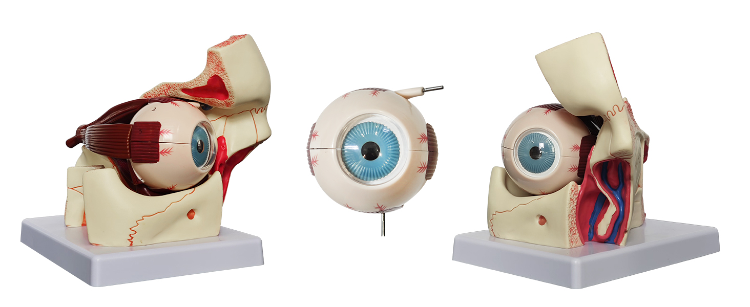 دقيق تشريحيًا - هذا نموذج تشريحي مكون من 12 جزءًا ثلاثي التكبير للتشريح المداري لمقلة العين، بما في ذلك الأجزاء القابلة للإزالة التالية: المدارات، وصلبة جدار مقلة العين، ونصفي الكرة العلوي والسفلي، والعدسة، والفكاهة الزجاجية، والعضلات خارج العين والأعصاب البصرية.