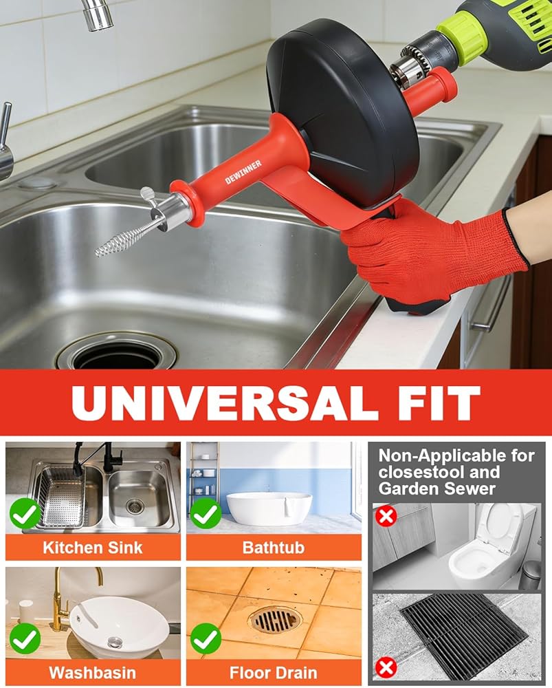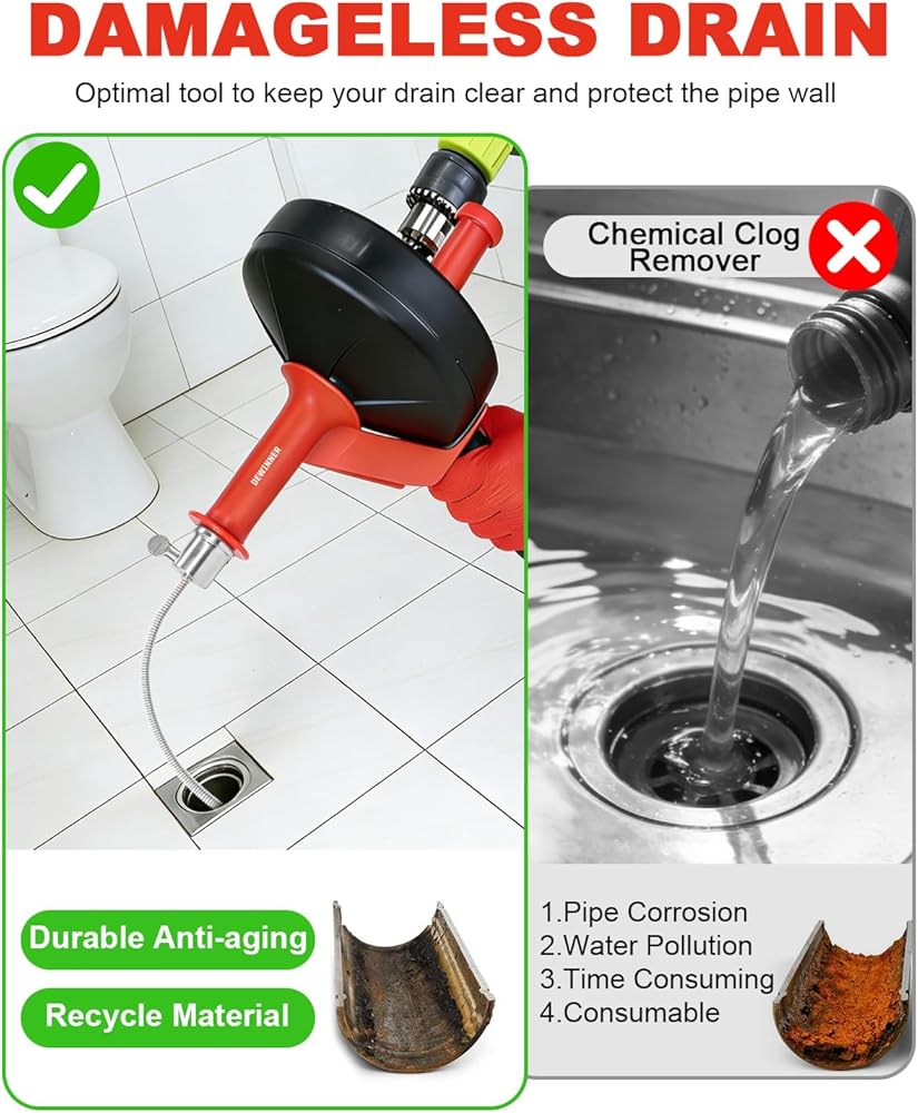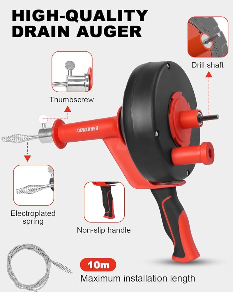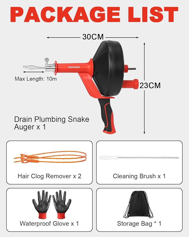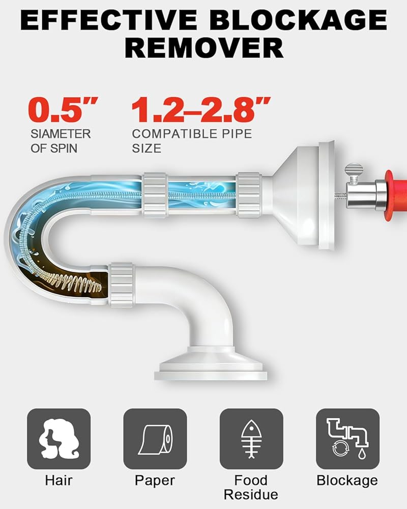 تنظيف عميق: كابل فولاذي مرن بطول 10 أمتار / 33 قدمًا يصل إلى عمق أنابيب الصرف المنزلية؛ يساعد على إزالة الانسدادات الشائعة مثل تراكم الشعر وبقايا الطعام ورواسب الصابون من مصارف المطبخ والحمام والدش