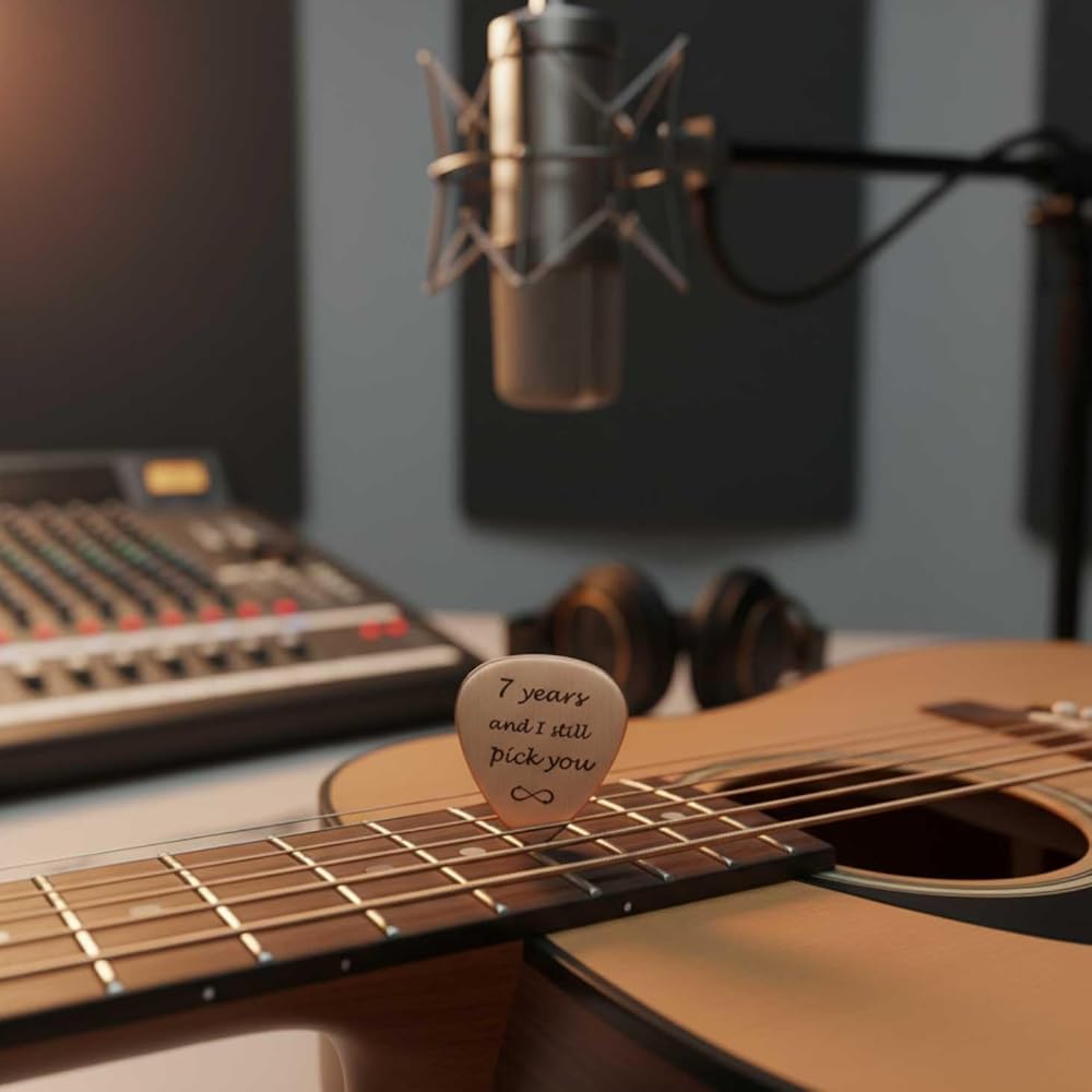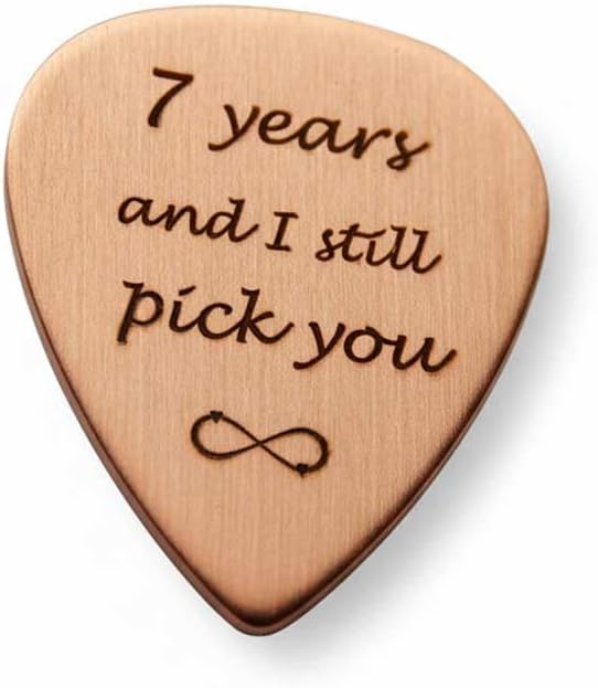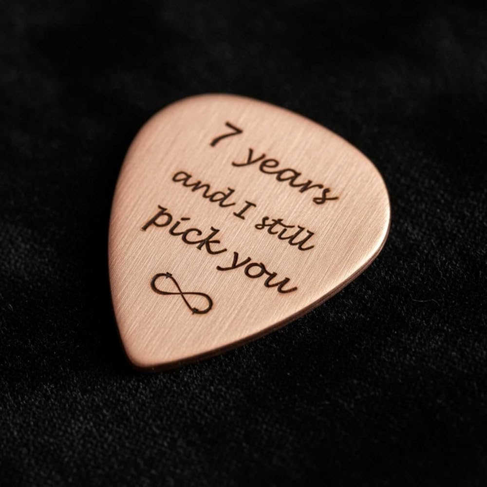Celebrate your 7th wedding anniversary with a gift as timeless as your love. This solid copper guitar pick is engraved with the romantic phrase “7 years and I still pick you” and an infinity symbol, making it both a functional plectrum and a heartfelt keepsake. Copper is the traditional material for the 7th anniversary, symbolizing warmth, strength, and durability—just like your relationship. Whether given to a husband, wife, or partner who loves music, this engraved pick will be treasured for years to come.
