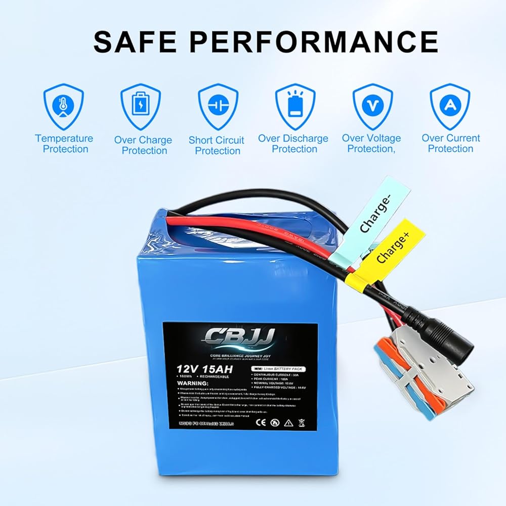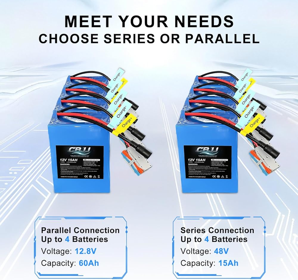التوسع المرن: تدعم بطاريات 12 فولت الأسلاك المتسلسلة لإنشاء نظام بنك بطارية 24 فولت/36 فولت/48 فولت 15 أمبير. بالإضافة إلى ذلك، يمكن توصيلها بالتوازي لبناء نظام بنك بطارية 12V 24Ah/45Ah/60Ah. علاوة على ذلك، يمكنك توصيل ما يصل إلى 4 بطاريات في كلا السلسلتين أو بالتوازي. يرجى ملاحظة التأكد من شحن جميع البطاريات بالكامل بشكل فردي قبل توصيلها على التوالي. بعد توصيل البطاريات على التوالي أو بالتوازي، يجب استخدام شاحن مخصص يتوافق مع الجهد الإجمالي لحزمة البطارية.